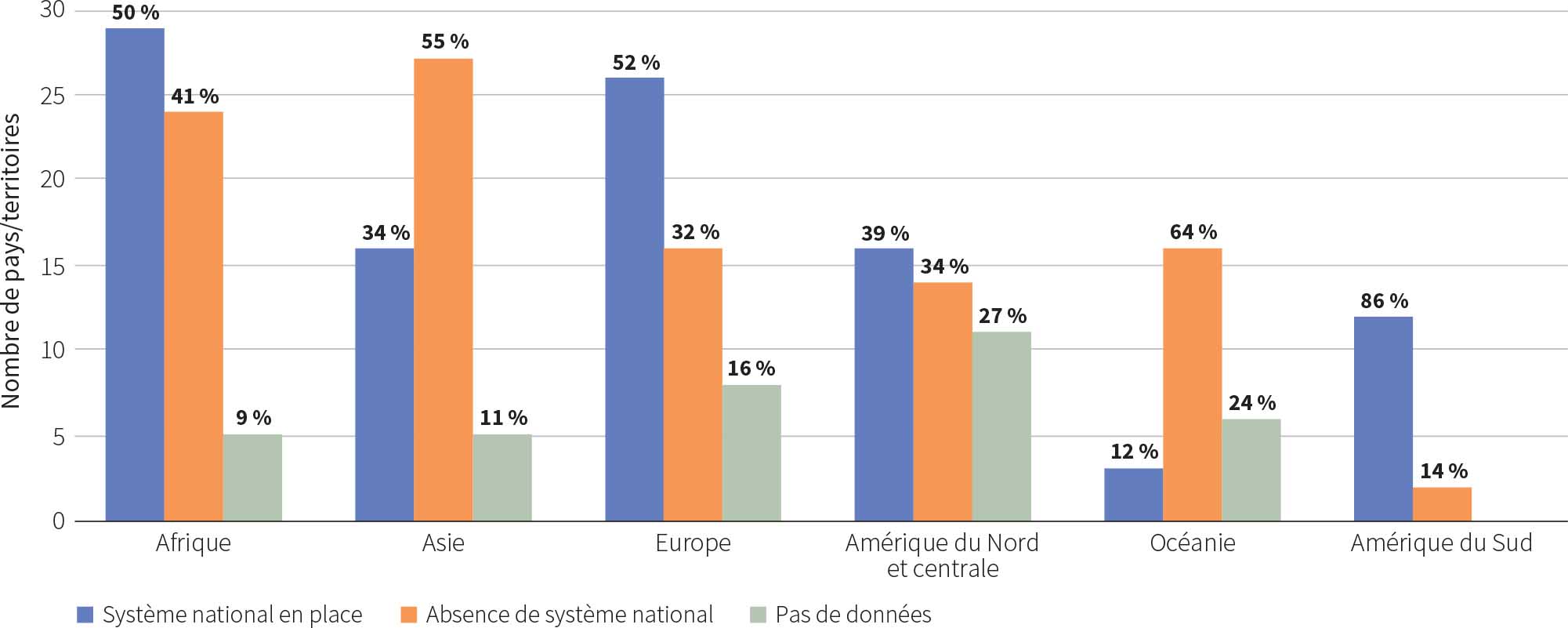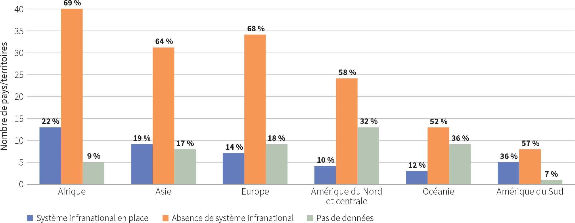 Parmi les régions, l’Amérique du Sud présente le pourcentage le plus élevé de systèmes de traçabilité des produits ligneux en place aux niveaux national et infranational (86 pour cent et 36 pour cent, respectivement, des pays et territoires de la région). Quelque 50 pour cent des pays et territoires en Europe et en Afrique disposent d’un système de traçabilité national, mais les pourcentages sont inférieurs en Asie (34 pour cent) et en Océanie (12 pour cent).