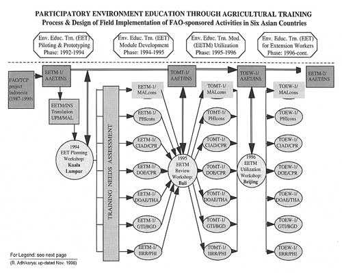 Workshop participants discussed and agreed on EET's conceptual framework, strategy and methods, operational processes and implementation procedures. Such EET standard operating procedures or guidelines included participatory mechanisms which will ensure the relevance and client-orientation of EET programmes, and provide horizontal knowledge interchange and experience sharing among institutions and EET planners within a country or region, or globally. Eight institutions from six Asian countries decided to undertake EET activities, initially supported by FAO/SDRE with small grants ranging from $7 000 to $10 000. Several workshop participants who are not undertaking EET activities agreed to join a panel of non-implementing EET resource persons who could provide advisory, review, monitoring and trouble-shooting services. This network of resource persons has proved critical in providing participatory consultations, peer learning and reviews, quality assurance and standards, as will be discussed later. The design of the FAO/SDRE sponsored Participatory Environment Education through Agricultural Training programme are shown in Figure 1. The list of EET participating institutions and network members as of September 1996 is shown in Annex 2.