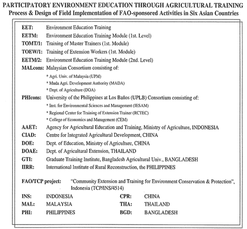 As will be discussed later, the training institutions participating in EET activities in other countries are also those that provide training to most of the agricultural extension and other field outreach workers. Such institutions are the key agricultural training centers in their respective countries or have the official mandate to carry out in-service training for agricultural personnel. Furthermore, these selected institutions perceive that their mandate is compatible with and supportive of environment education goals. The incorporation of environment education into their existing training curriculum and extension programme is expected to generate synergy that will facilitate EET programme sustainability and institutionalization.