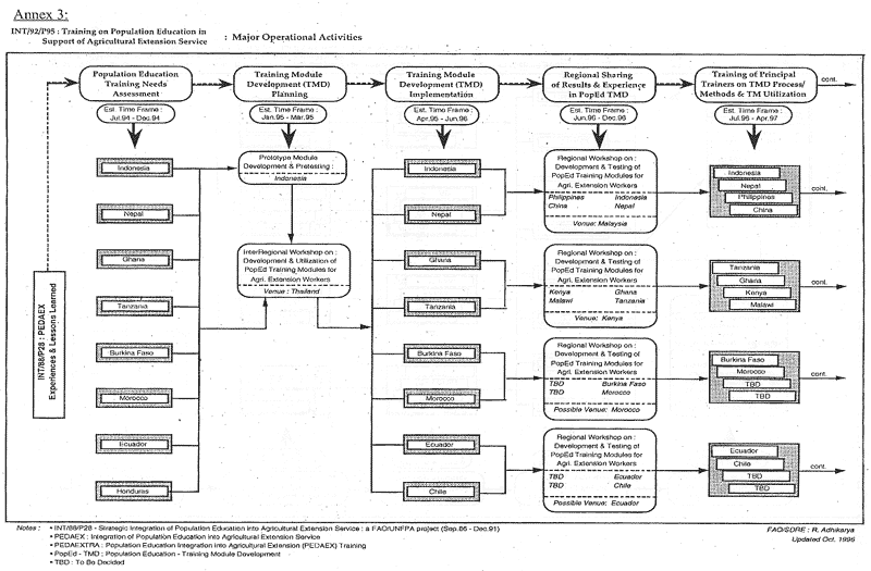 Through this PEDAEXTRA project (INT/92/P95), coordinated and managed by this author until October 1996, 12 institutions in 12 countries (Tanzania, Ghana, Malawi, Kenya, Burkina Faso, Morocco, Nepal, Indonesia, the Philippines, China, Ecuador and Chile) have collaborated since 1994 in integrating population education into agricultural extension and training programmes. The PEDAEXTRA strategy and activities are similar in design to those of the EET described above. The PEDAEXTRA operational process is attached as Annex 3.
