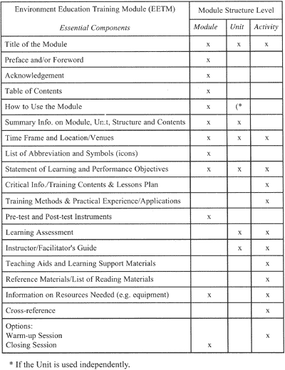 An important component of the EET process is participatory curriculum development (PCD) activity through of training module writing workshop and materials packaging workshops by local trainers and of multi-disciplinary resource persons. Such an approach emphasizes the importance of having learner-centred, client-focused, needs-based EET modules or materials, instead of expert-driven and top-down training packages which may not be relevant to trainees' needs and the specific learning objectives. While a PCD approach may be more difficult to undertake, time-consuming and perhaps rather expensive, it is more likely to be cost-effective, locally relevant and properly utilized compared to the common but often unsuccessful and unsustainable practice of imposing on local trainers to use imported packages of training materials.