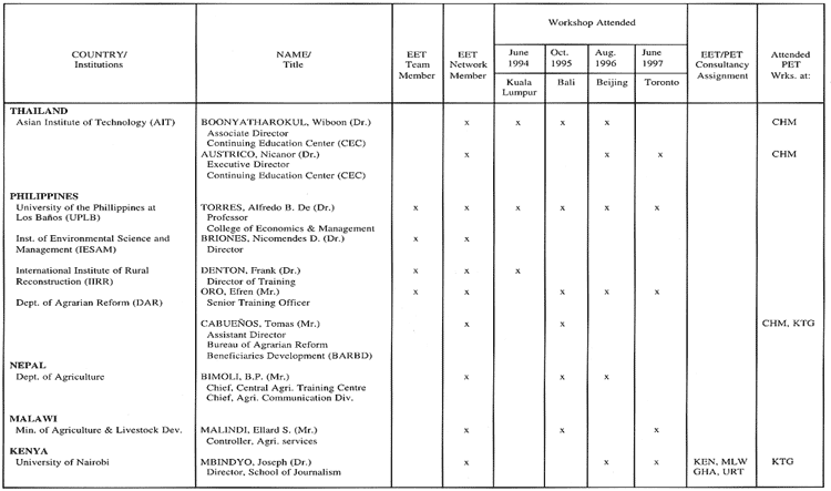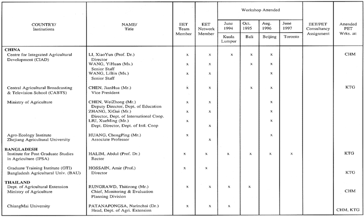 Furthermore, a panel of EET resource persons, highly qualified and experienced in relevant fields such as environment, agriculture extension, education, training and communication, has been established to provide "on-demand" advisory, consultative and trouble-shooting services. They have provided useful ideas and suggestions during EET regional and national workshops and made objective assessments and comments to participating training institutions for improving their EET activities. The list of EET participating institutions and EET key network members as of October 1997 is shown in Annex 2.