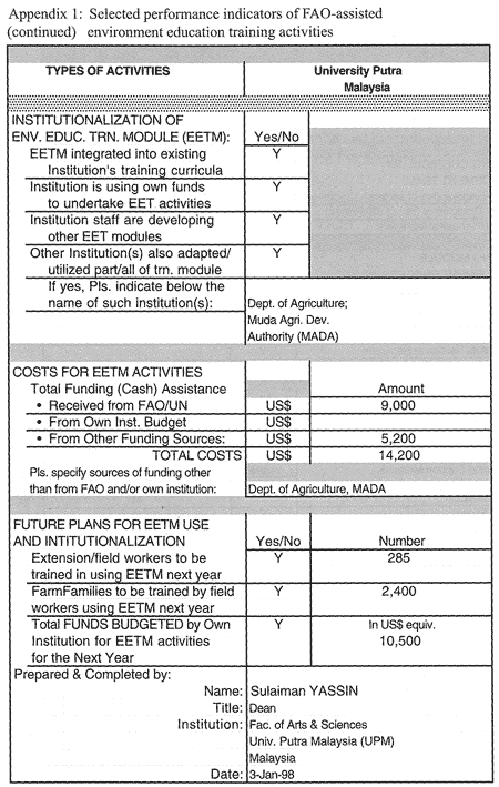 The writer was first contacted by SDRE to organize a regional workshop on "EET through agricultural extension" from 20 to 25 June 1994 in Kuala Lumpur, Malaysia. FAO/SDRE provided technical and funding assistance to UPM in organizing the workshop. Which was attended by all representatives of the Malaysian consortium with a total of 23 participants from ten countries. At this workshop, the important issues in environment education relevant to agricultural extension were identified. An FAO-supported experimental and prototype EETM developed by the AAET of Indonesia was also presented at the workshop and it served as a good working model for the participants.