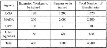 The immediate beneficiaries for the EETM were identified as the trainers within the RERC of the DOA and those of MADA. Once they have been trained, extension workers of these two agencies would then benefit through the regular in-service training sessions and finally the farmers would gain through their interactions with the extension officers within their own farmer groups.