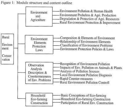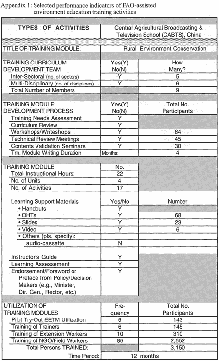 In considering the key roles of Chinese farmers in rural environmental protection, the DE/MOA and the Department of Energy and Environment Protection, DEEP/MOA tried to review the approaches and problems of environment education programmes targeted towards the farmers. It appeared that the main difficulties encountered were the lack of appropriate training materials on environment education and the systematic approach and methods of training. In November 1994, with the assistance of the FAO, the DE/MOA undertook a project on environment education targeted to train farmers and extension workers, especially those training in the FGCT programme. The project was to develop an EETM which would be used in the training programme.