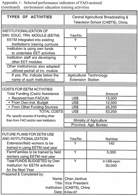 Based on the identified needs of China's rural development programme and the agreement between DE/MOA and FAO, the implementation of the farmers' EET through the CABTS distance education programme, the implementation of EET activities have progressed rapidly since 1995.