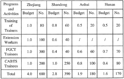The officials of the FGCT programme of BA/ZPG then organized a training course from 10 to 12 September 1995 for 45 FGCT trainers from various counties in Zhejiang Province, using the EETM developed. Through this training the FGCT officials and trainers became more familiar with the training contents of all the activities in the module. The seven trainers from Jinhua City and Deqing County who had been trained were then designated to conduct training using EETM in their classes.
