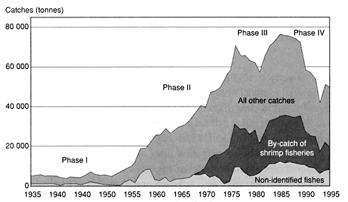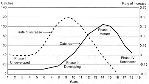 The duration and slope of the different phases are results of both the rate of increase of fishing intensity (and mortality) and the biological carrying capacity of the resource (FAO, 1996).