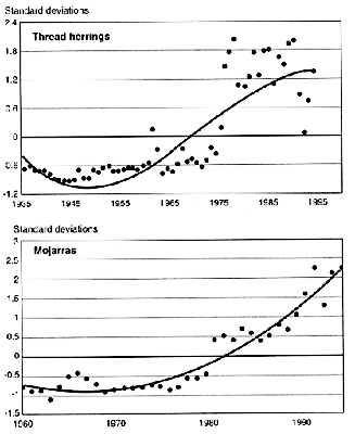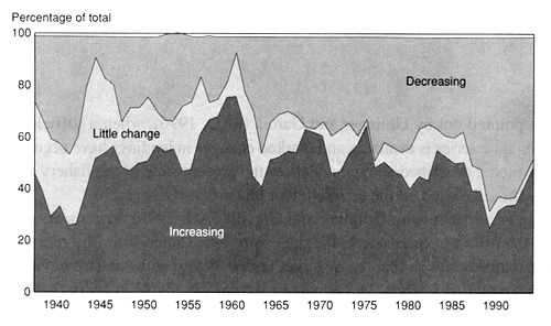 The results of this classification are illustrated in Figure 3, which shows the percentages of the 21 species or species groups that fall into each of the three categories in a particular year. In spite of the oscillations observed, it can be noted that the percentage of the resources in the increasing category, which was about 35 percent at the beginning of the series, surpassed 70 percent at the end of the 1950s and oscillated around the 50 percent level until the mid-1980s. In the last ten years of the series, the percentage of resources in this category returned to its original level. The percentage of the resources showing little change diminished considerably over the entire period (from about 30 to only 2 to 3 percent). This category of stable landings corresponds to a latent undeveloped phase of a fishery before it starts to grow (Phase I), to stabilization at mature exploitation (Phase III) or, in a few cases, to a lower level after a fishery has collapsed (Phase IV). In any case, the decreased percentage of resources showing little change indicates that there has been a reduction in the number of developing or mature fisheries (Phase II or III) and confirms the tendency (similar to that of world fisheries) for the majority of fisheries to fall into one of two main categories: in expansion or in decline.