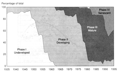 The standardized landings of each of the series were then fitted with a third-degree polynomial function calculating the slope of the fitted line for every successive pair of years, and the curves were sliced into segments corresponding to the phases of increasing, little change or decreasing. It was assumed that the phases of increase or decrease correspond to the developing (Phase II) or senescent (Phase IV) stages of fishery development, respectively. The phase of little change was subdivided into high-exploitation mature (Phase III) or undeveloped (Phase I) phases, depending on whether the observed period of little change was followed by a period of increase or not. Once the resources matching each profile had been identified, the percentage of resources in each phase was calculated for each year separately and for the whole data set. The overall pattern is illustrated in Figure 4. It clearly shows that in the mid-1950s most of the fisheries were undeveloped (Phase I) while, in the mid-1960s, they were nearly all in the developing phase (Phase II).