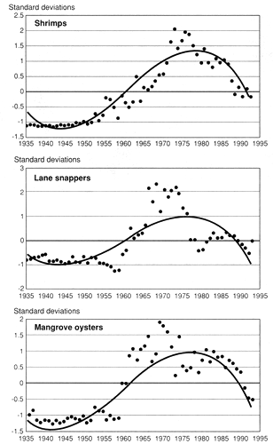 FIGURE 5: Average standardized landings of shrimps, lane snapper and mangrove oyster1