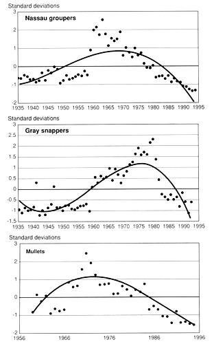 FIGURE 6: Average standardized landings of Nassau grouper, gray snappers and mullets1