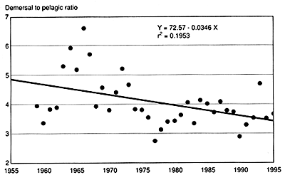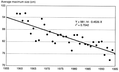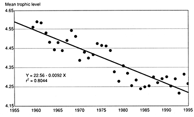 Figures 8 and 9 show the linear regressions (highly significant, P < 0.001) of the mean trophic level and of the average maximum size for the 1955 to 1995 period. The negative trends are clearly visible and indicate a gradual transition from landings of large piscivorous fishes to small fishes and invertebrates feeding on smaller organisms (plankton and bottom invertebrates). These results are in line with those obtained by Pauly et al (1998) on the global scale.