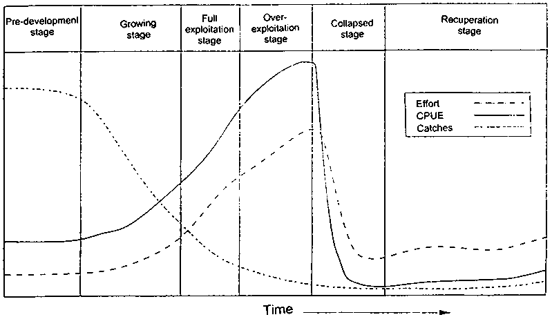 The figure describes a fishery cycle, from its beginning as a mainly subsistence-exploitation phase. Then follows much growth, when the development of the fishery occurs by the entry of new vessels and by maximizing the profitability through the implementation of the best available technology, until full resource-exploitation is achieved. From this point to the over-exploitation of the resource is only one step, and this is unavoidable if the race-for-fish is not stopped. Traditional administrations have proven ineffective to limit the increase of investment of the private sector, which gives rise to over-capitalisation of the industry and collapse of the fishery.