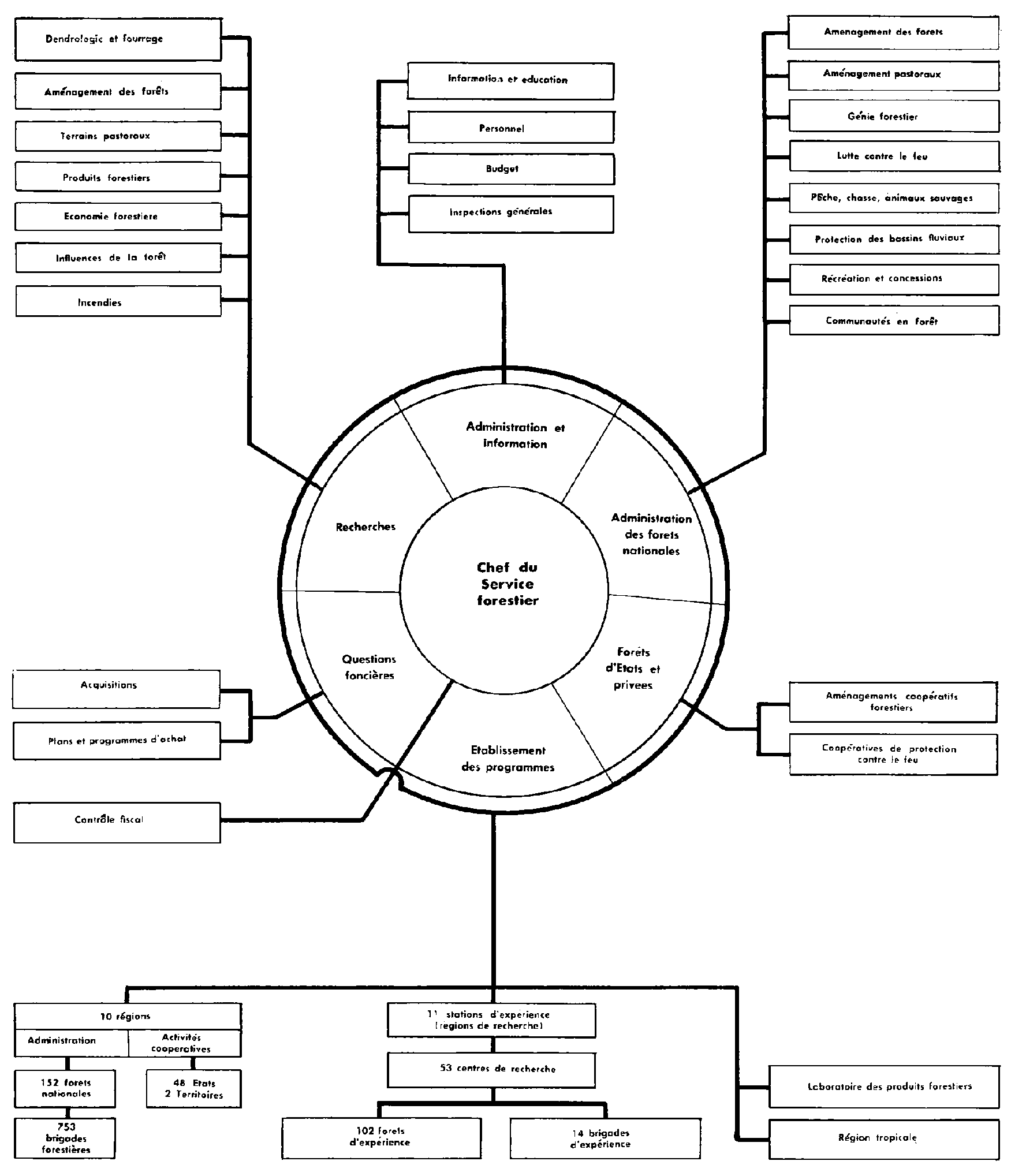 Le laboratoire des produits forestiers se trouve à Madison (Wisconsin). La majeure partie des recherches relatives à l'aménagement des forêts, des pâturages et des bassins de réception s'effectue dans les bois et sur les pâturages mêmes. L'expérience a démontré que des centres expérimentaux trop éloignés les uns des autres même dans les forêts domaniales ou autres territoires du Domaine ne peuvent être administrés et protégés de façon satisfaisante, ni utilisés à des fins de recherches intensives ou de longue haleine. On a donc, afin de pouvoir disposer de laboratoires expérimentaux appropriés, réservé sur les forêts nationales existantes et autres terres fédérales, des zones déterminées qui sont attribuées de façon permanente à chacune des stations régionales pour leurs travaux expérimentaux. On trouvera au Graphique 3 l'organisation schématique des stations régionales d'expérimentation forestière.