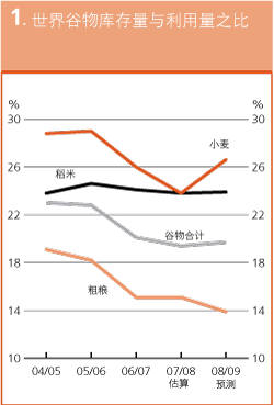 粮农组织全球谷物供求指标预计2008/09年度世界谷物季末库存量与下年度世界谷物利用量趋势之比仅为19.7%,比2007/08年度19.4%的估算值(30年低点)仅略微有所提高,这是新年度(2008/09)市场形势继续紧张的有力证明。在主要谷物品种中,预计粗粮(尤其是玉米)的市场形势最为紧张。由于预期利用总量高于世界产量,预测粗粮库存量与利用量之比将降至13.9%,为30年来的最低点。在稻米方面,预计该比率将为23.9%,仍相对较低,与2007/08年度基本持平。但预计小麦的该比率将反弹近3%,至26.6%。预测2008年世界小麦产量的预期增长将有助于库存量一定程度的补充和供应形势的改善。