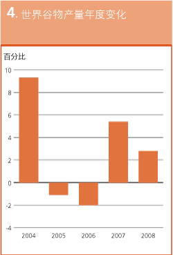 估计2008年世界谷物产量增长2.8%,在去年获得创纪录收成之后再次出现较大幅度的增长,这在全球供求形势紧张的背景下是一个积极的走向。但鉴于在某些主要生产国粗粮季节尚远未收尾,且亚洲主要稻米季节才刚刚开局,因此这一预测仍十分粗略,最终结果将取决于今后几个月的天气条件。