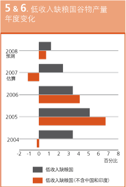 尽管预测2008年低收入缺粮国谷物产量将进一步增长,但增长率仅为1.2%,增幅连续第三年放缓。但与2007年不同的是,若不包括占该组别国家谷物总产约三分之二的中国(大陆)和印度的话,估计今年其余低收入缺粮国的产量增长0.7%,在去年出现下滑之后取得这一小幅增长是个积极迹象。但今年这些国家产量增幅有限意味着它们将继续严重依赖进口来满足2008/09年度的消费需求,鉴于目前国际谷物价格仍保持在很高水平,这对它们新一年的财政资源又形成了十分沉重的负担。