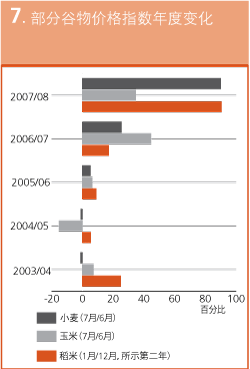 由于2007/08年度谷物产量低于利用总量,造成库存量的下降,多数谷物的价格大幅上涨,尽管2008年产量前景改善,但某些谷物的价格仍在上扬或保持在高位。由于国际小麦价格的飞涨,2007/08销售年度(7月/6月)小麦指数比2006/07年度提高了90%。这一大幅上升是在2005/06年度已提高了25%的基础上发生的。2007/08销售年度(7月/6月)玉米指数提高了35%,而上年度已提高了近45%。今年年初以来(2008年1-6月),稻米指数平均比2007年同期高出90%。2007销售年度(1-12月)稻米指数与2006年相比已经上升了17%。