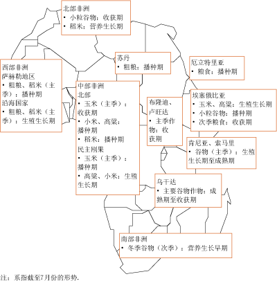 索马里、坦桑尼亚、乌干达和肯尼亚2008年主季谷物作物的收获工作正在进行或即将展开。在埃塞俄比亚,次季作物的收获工作正在进行。虽然3-5月的降雨在尾声时有所改善,但在埃塞俄比亚、索马里、肯尼亚西部及乌干达卡拉莫贾地区的大部,积雨量仍低于正常水平。因此,这些国家的收成前景仍普遍较差。苏丹2008年主要粗粮作物的播种工作已经展开。