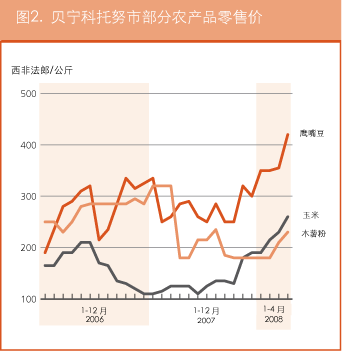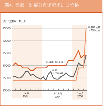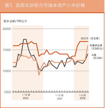 虽然该区域各国政府采取了多种措施,但高昂和不断上涨的粮价继续对整个次区域的消费者购买力和获取粮食的渠道造成影响。在塞内加尔首都达喀尔,2008年4月当地最重要的主食稻米的进口价格比去年同期上涨了20%。同样在该国,久尔贝勒的价格涨幅达43.1%,坦巴昆达的价格涨幅达47.1%。该次区域中部和东部地区对从国际市场的谷物进口依赖程度较低,形势也同样严峻:在瓦加杜古(布基纳法索)、巴马科(马里)和尼亚美(尼日尔),这些国家的主食品种小米2008年6月初的价格分别比去年同期上涨了33%、33%和24%。同期进口稻米的价格分别上涨了87%、39%和13%。在当地的新收成投放市场前,谷物价格的上行趋势很可能将继续下去。