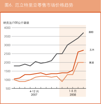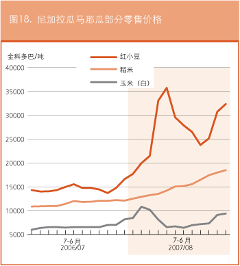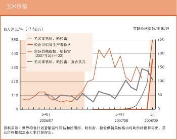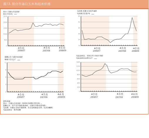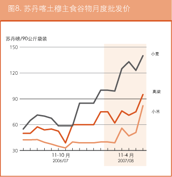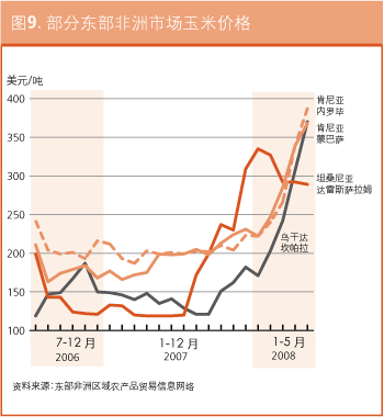 在厄立特里亚,在国际市场普遍上涨的影响下,阿斯马拉的粮食价格自2007年7月以来一直在稳步上扬。2008年5月面粉的零售价为每100公斤3700纳克法,比上个月增长了约9%,比去年同期涨了一倍还多。同样的,玉米的零售价在2008年5月为每100公斤2700纳克法,比2007年7月升了一倍。在埃塞俄比亚,虽然2007年底略有下跌,但2008年间谷物价格持续上扬。亚的斯亚贝巴的小麦价格从3月的426美元/吨涨至4月的438美元/吨。4月玉米的报价为324美元/吨,而去年同期仅为160美元/吨。随着价格的持续攀升,预计贫困农户将更难确保获得充足的粮食供应。