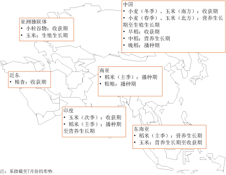 在阿富汗,目前正在收获的2008年雨育作物和今年晚些时候收获的灌溉作物的收获前景不佳。2007年10月至2008年5月间,大多数地区的雨量低于常年。该国中部地区和西部高原地区的降雪也少于常年,而通常较为干旱的南部今年也经历了罕见的多雨天气。在1、2月份的严寒之后,冬小麦作物受损严重。大多数地区的气温高于往年,加剧了干旱形势,因为积雪会较早就开始融化,且蒸发量也会大于往年。由于本年度的降雨和降雪量大幅减少,很有可能导致灌溉水源不足,从而影响2008年8、9、10月间冬季来临之前的作物耕作,最终影响2009年的收成。