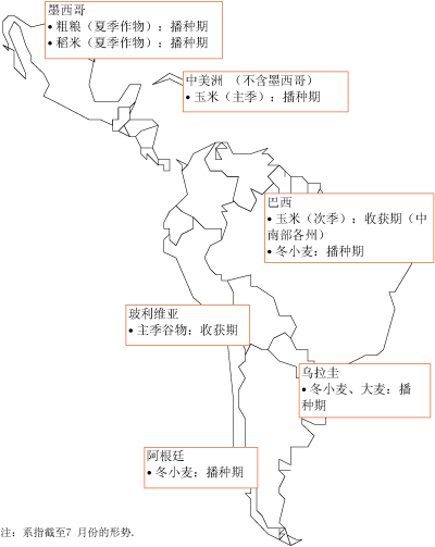 在巴西,官方预测第一季玉米作物产量为创纪录的4000万吨,比高产的去年增产约10%。主要原因是天气条件良好,加之广泛使用选育的种子,以及化肥用量增加,使玉米单产提高。在产量约占全国第一季玉米作物产量四分之一的巴拉纳州,估计平均单产首次达到创纪录的每公顷7吨,比过去五年的平均单产高出约25%。在中西部各州,目前干燥的天气有利于将于今年7月底完成的2008年第二季冬玉米作物的收获。初步预测第二季玉米作物的产量也将达创纪录的1840万吨,主要是因为播种时国际粮价走高,促使农民将播种面积从2007年的460万公顷扩大到了500万公顷。此外,尽管因大豆收获延误导致播种期有些推迟,但由于降雨分布适宜和及时使用化肥,第二季玉米作物单产还是有望好于常年,达每公顷3.7吨。在阿根廷,2008年玉米作物收获工作基本完成,官方初步估计总产约为2100万吨,比单产创纪录的去年减产约100万吨。在乌拉圭,降雨减少和4、5月份的霜冻对2008年夏季玉米作物单产造成负面影响。尽管目前还没有官方估算数字,但预期的44万吨历史最高水平至少需要下调15%。