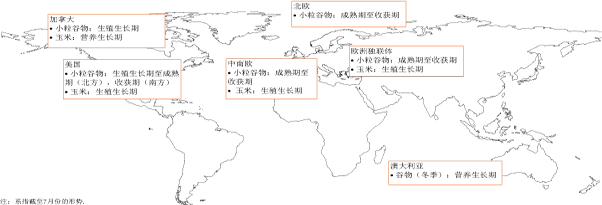 在美国,截至6月底,南部一些州冬小麦收获工作已经深入开展,但因暴雨而进展比常年缓慢。尽管对过度湿润的条件可能对谷物质量造成负面影响而有所担忧,特别是在主产区堪萨斯州,但目前还没有数量损失的迹象。最新官方预测显示冬小麦产量约为4900万吨,比去年增产近20%。6月底大部分春小麦长势良好,且播种面积估计比上年扩大约9%,最新迹象仍显示春小麦将获得丰收。因此,预测小麦总产将达约6600万吨,比上年增产1000万吨,为1998年以来的最高产量。在粗粮方面,由于持续暴雨延误了许多主产区的玉米播种,洪涝对已经播种的作物造成了损失,因此过去几周粗粮前景有一定幅度的看淡。据美国农业部6月30日的官方《播种面积报告》,在6月底通过一项专门最新情况调查的形式对暴雨的影响进行分析后认为,2008年玉米收获面积为约3190万公顷,低于2007年的3500万公顷。尽管已经预计到今年播种意向下降将造成播种面积的减少,但恶劣的条件还将会导致收获面积与播种面积之比的下降,因为一些受损的作物没有被重新补种或需要重新补种,或者更多地转向补种其他作物,如生长期更短的大豆。鉴于作物播种推迟或洪涝影响,作物单产前景将有所降低,目前预测2008年美国玉米总产约为2.93亿吨,但最终还要取决于今后几个月的天气状况。