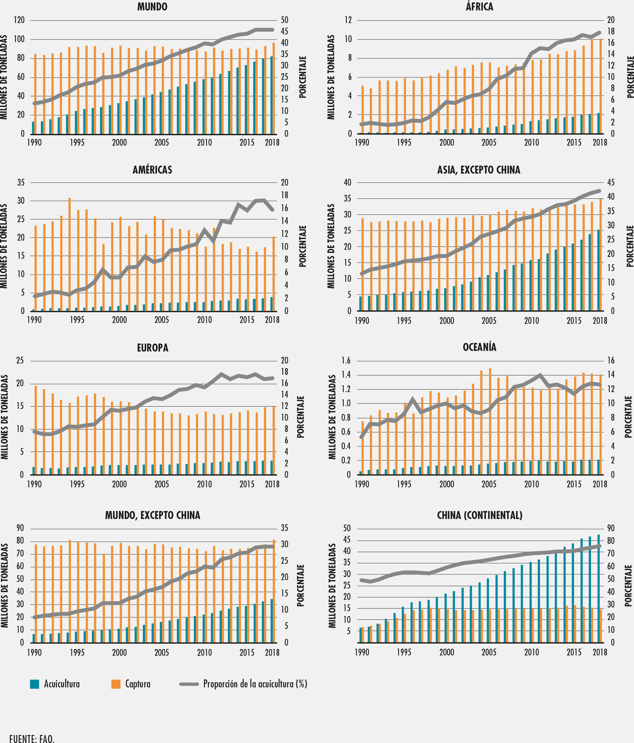 8. Producción acuícola mundial de animales acuáticos y algas, 1990-2018
