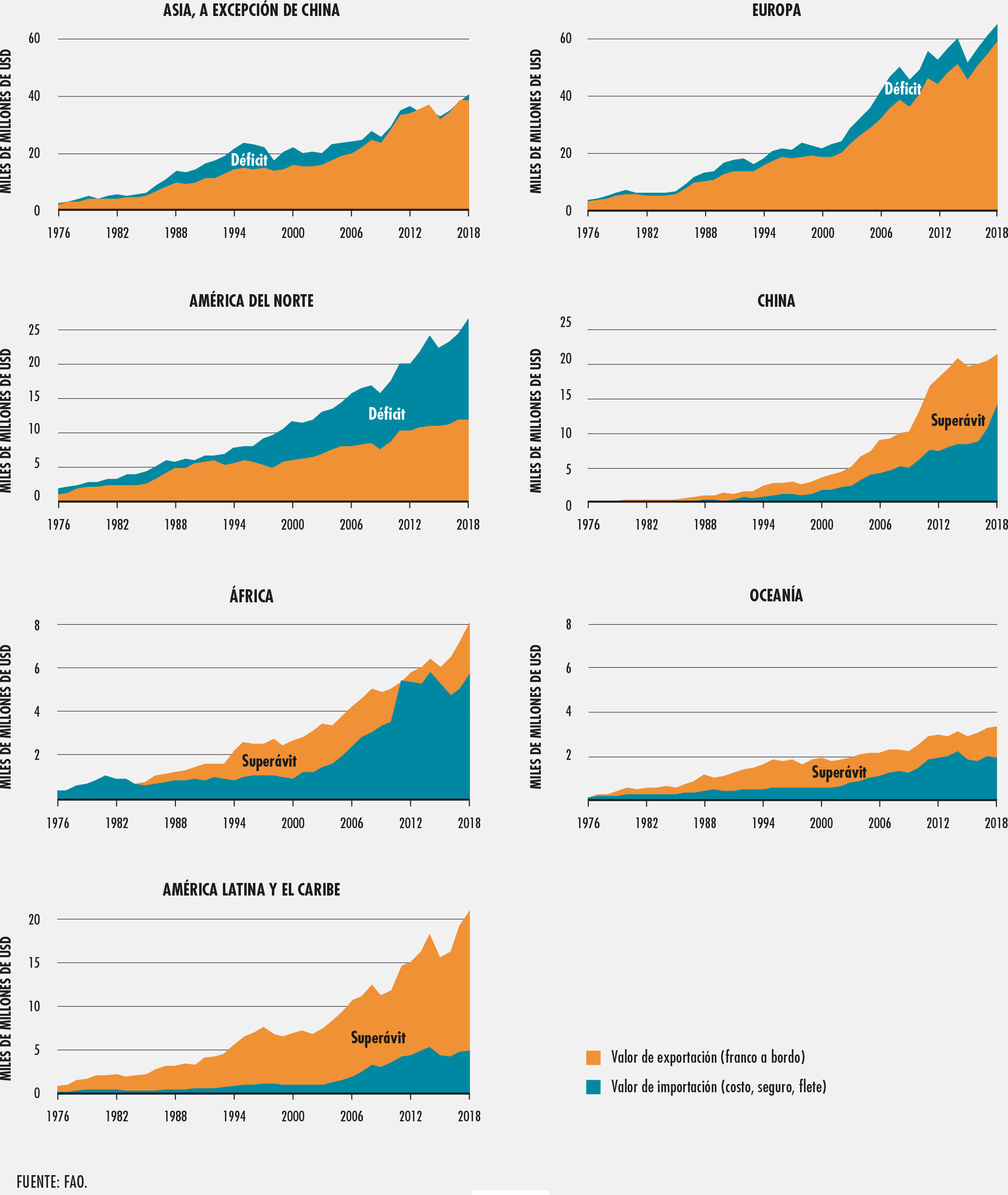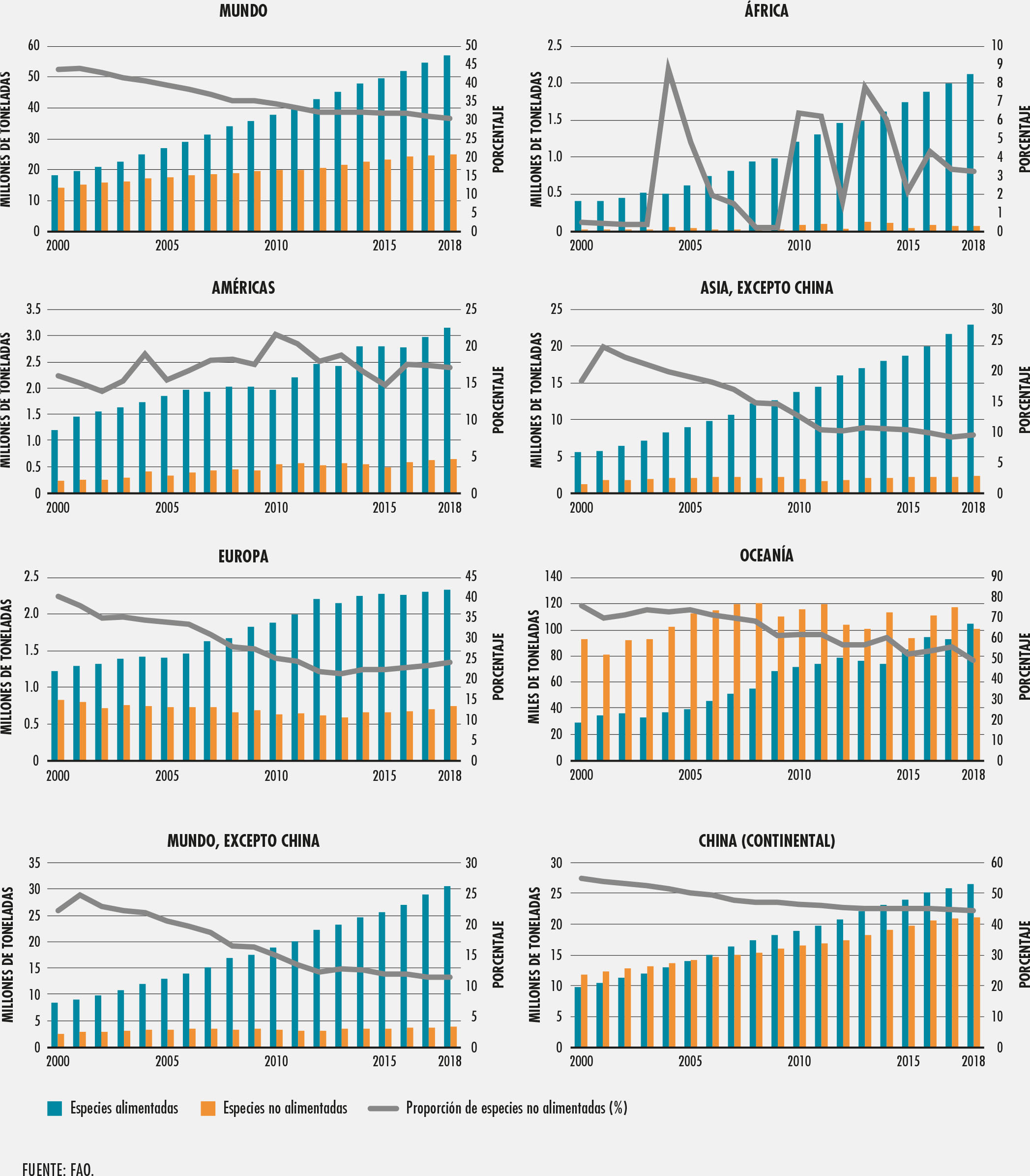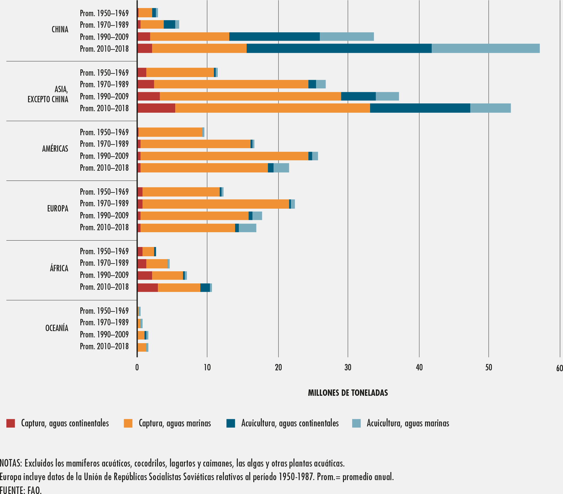6. Producción acuícola de los principales grupos de especies por continente en 2018