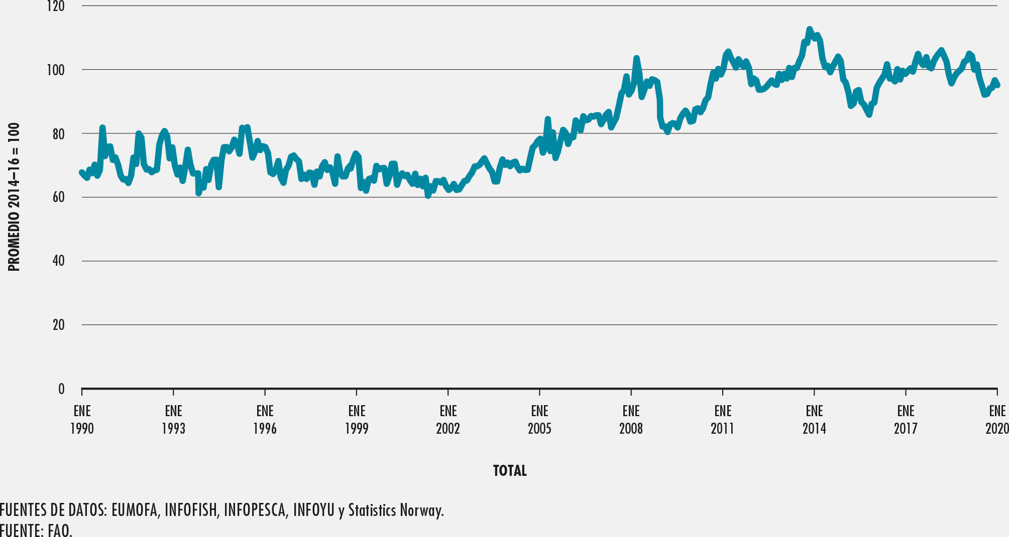 Tveterås, S., Asche, F., Bellamare, M.F., Smith, M.D., Guttormsen, A.G., Lem, A., Lien, K. y Vannuccini, S. 2012. “Fish is food – the FAO’s Fish Price Index”. PLoS ONE, 7(5): e36731 [en línea]. [Consultado el 20 de marzo de 2020]. (disponible en: https://doi.org/10.1371/journal.pone.0036731).