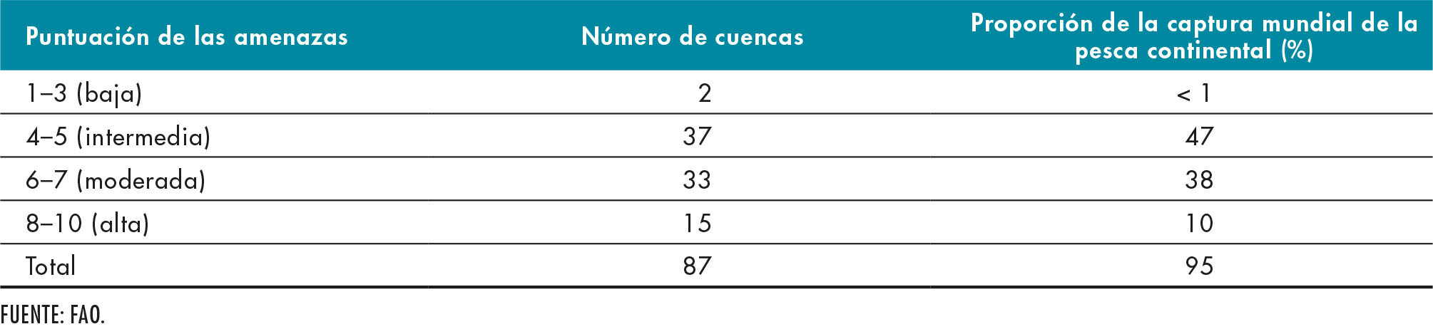 21. Puntuación de las amenazas para las cuencas que apoyan la pesca continental