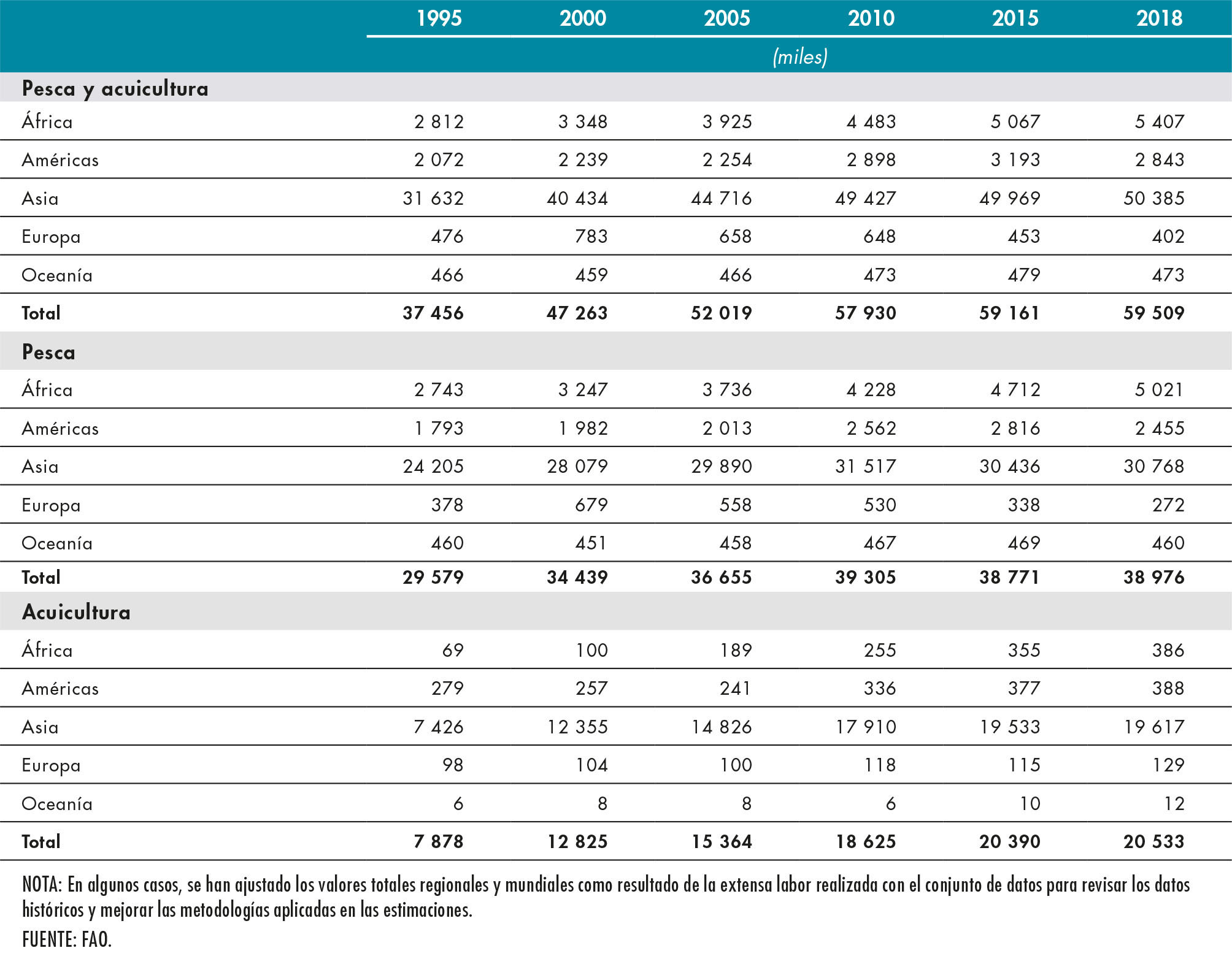 12. Número de personas empleadas en la pesca y la acuicultura en el mundo, por región