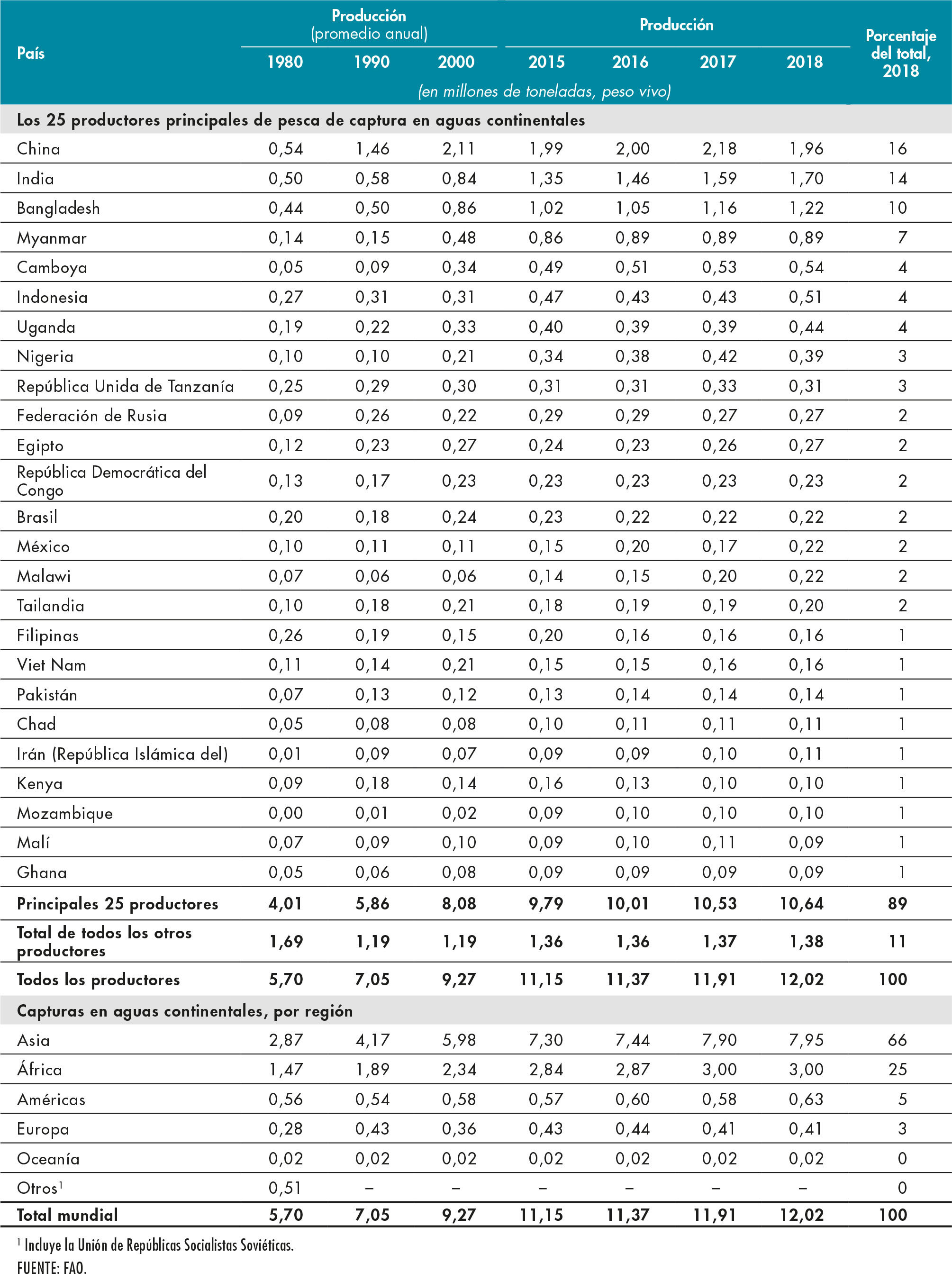 7. Los cinco principales productores mundiales de pesca de captura en aguas continentales