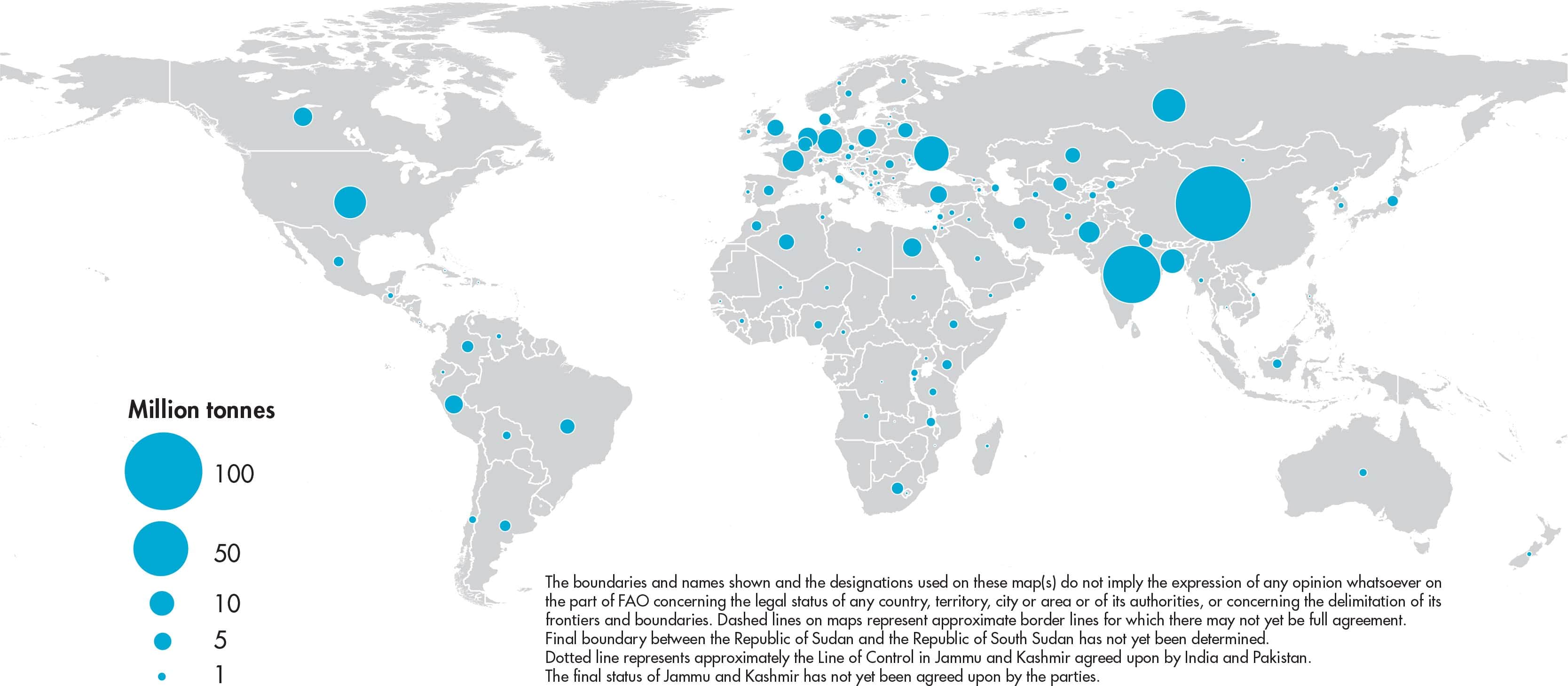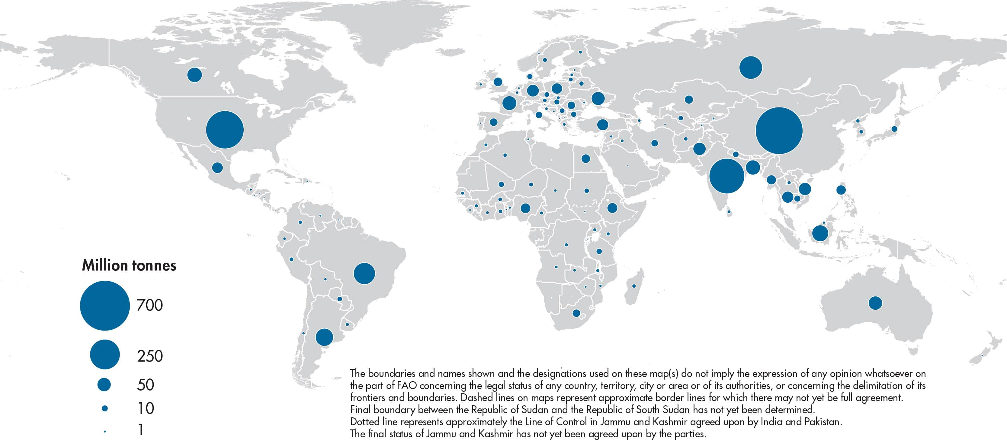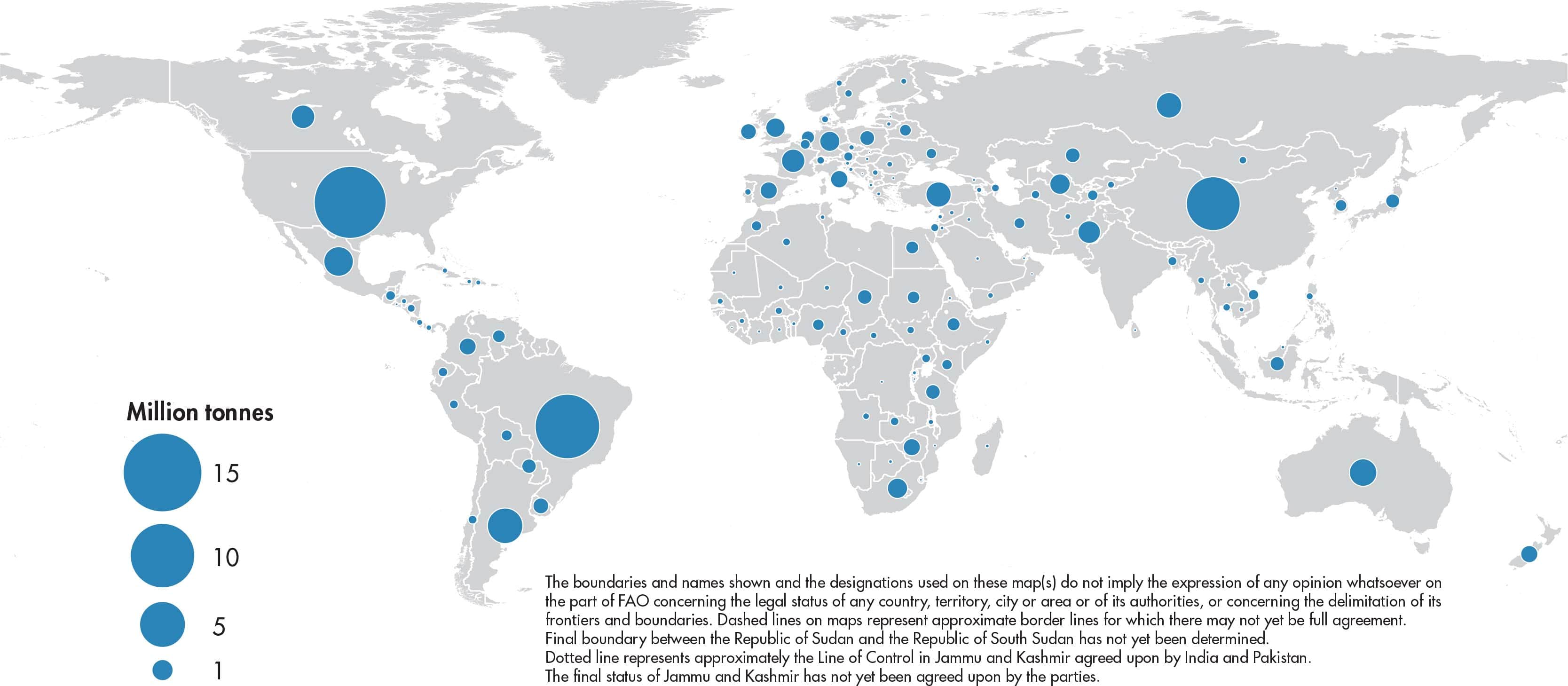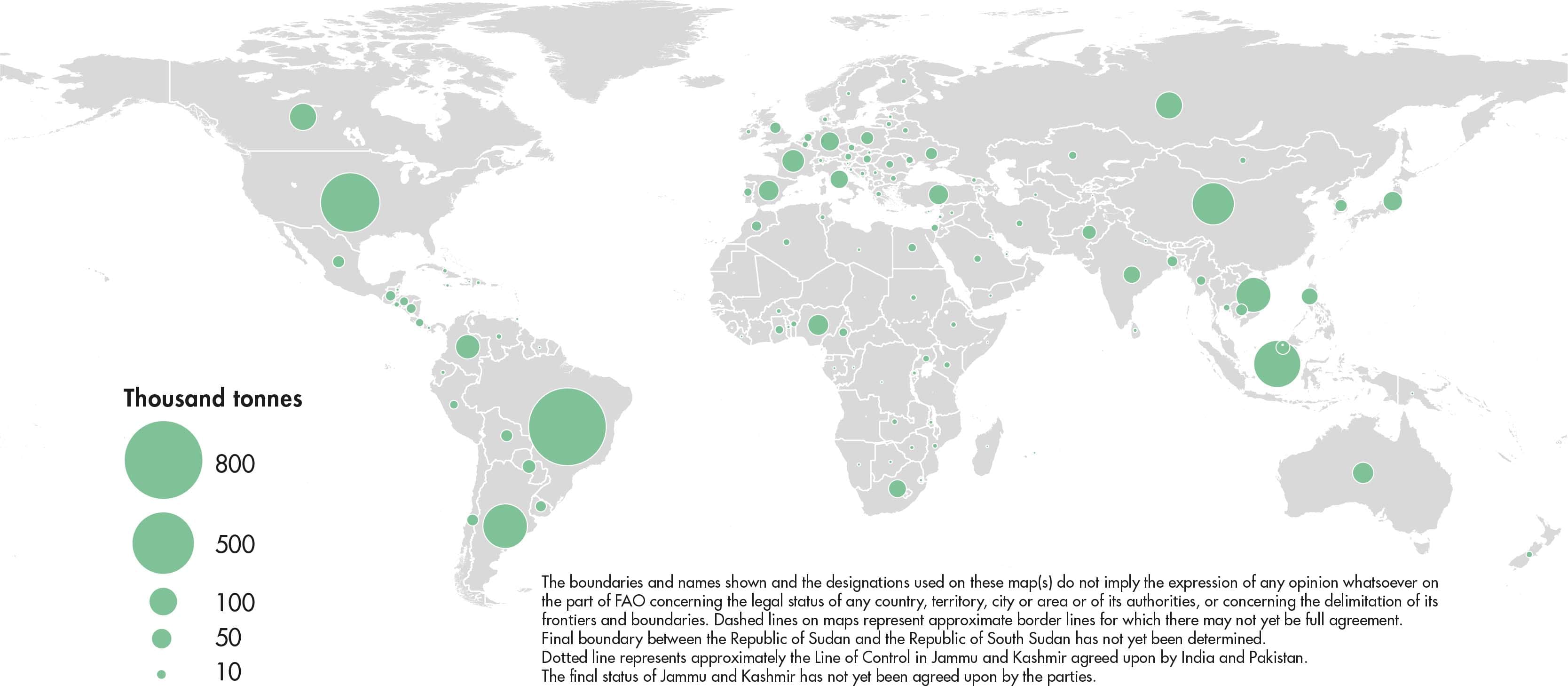 Figures relate to the total domestic production inside or outside the agricultural sector, i.e. they include non-commercial production and production from kitchen gardens. Unless otherwise indicated, production is reported at the farm level for crop and livestock products (i.e. in the case of crops, excluding harvesting losses) and in terms of live weight for aquatic animal products (i.e. the actual ex-water weight at time of catch). All data shown relate to total meat production from both commercial and farm slaughter. Data are expressed in terms of dressed carcass weight, excluding offal and slaughter fats. Production of beef and buffalo meat includes veal; mutton and goat meat includes meat from lambs and kids; and pig meat includes bacon and ham in fresh equivalent. Poultry meat includes meat from all domestic birds and refers, wherever possible, to ready-to-cook weight.