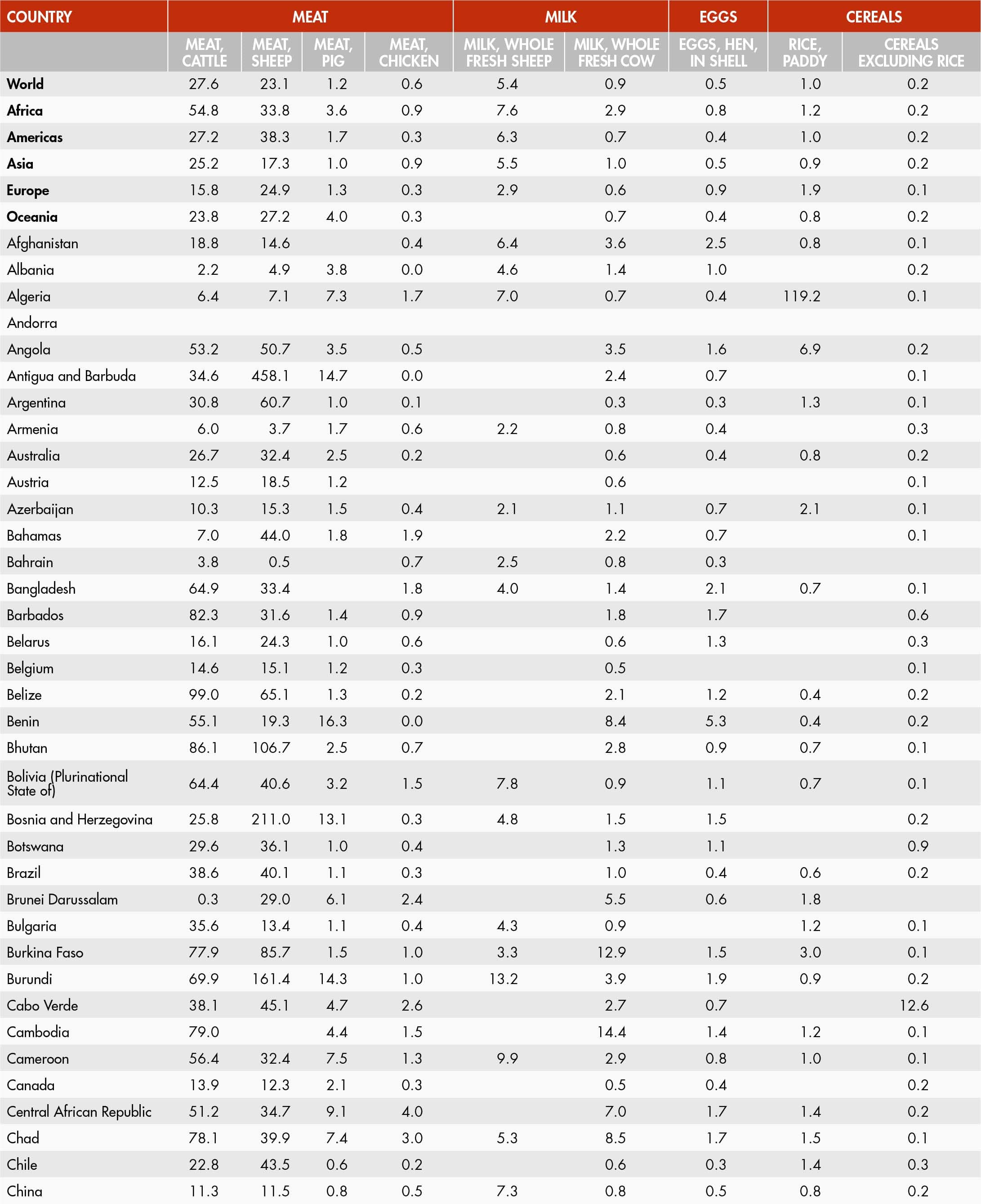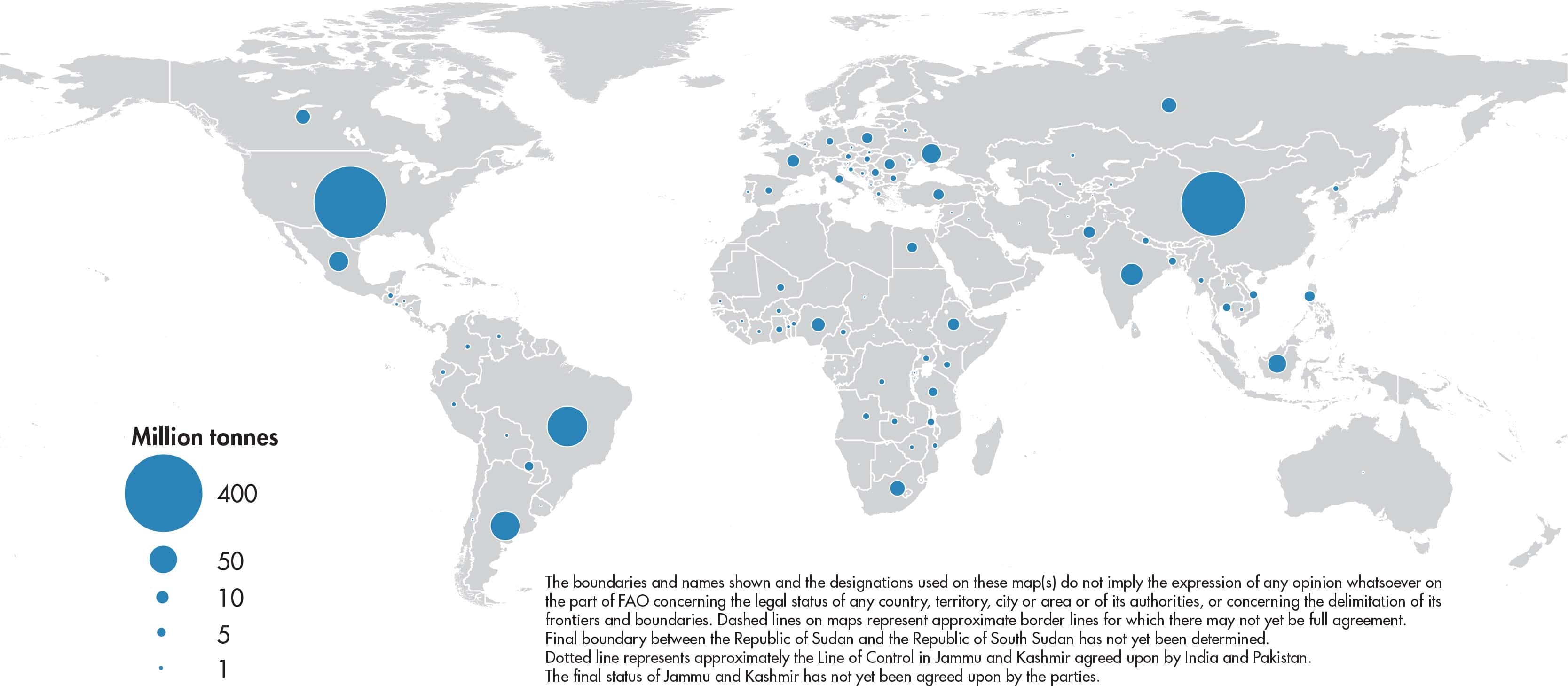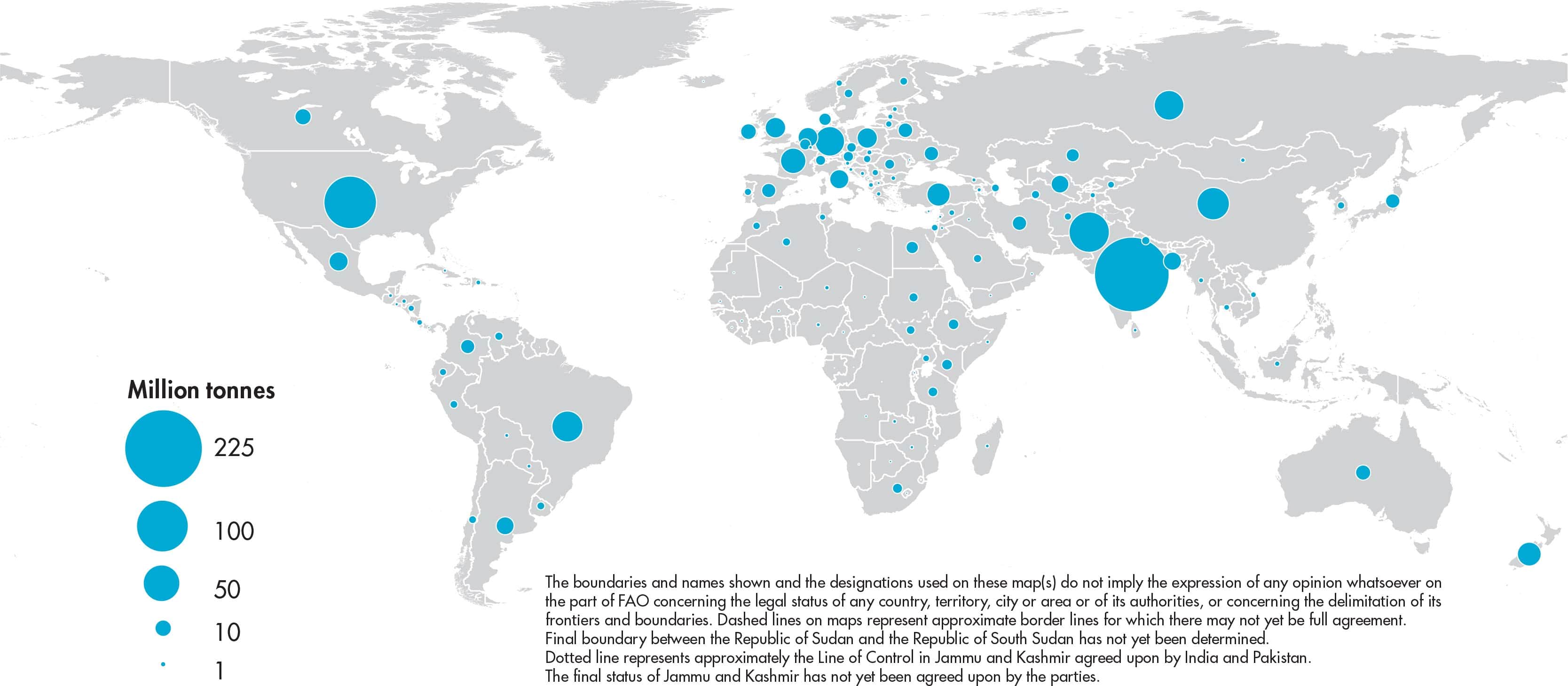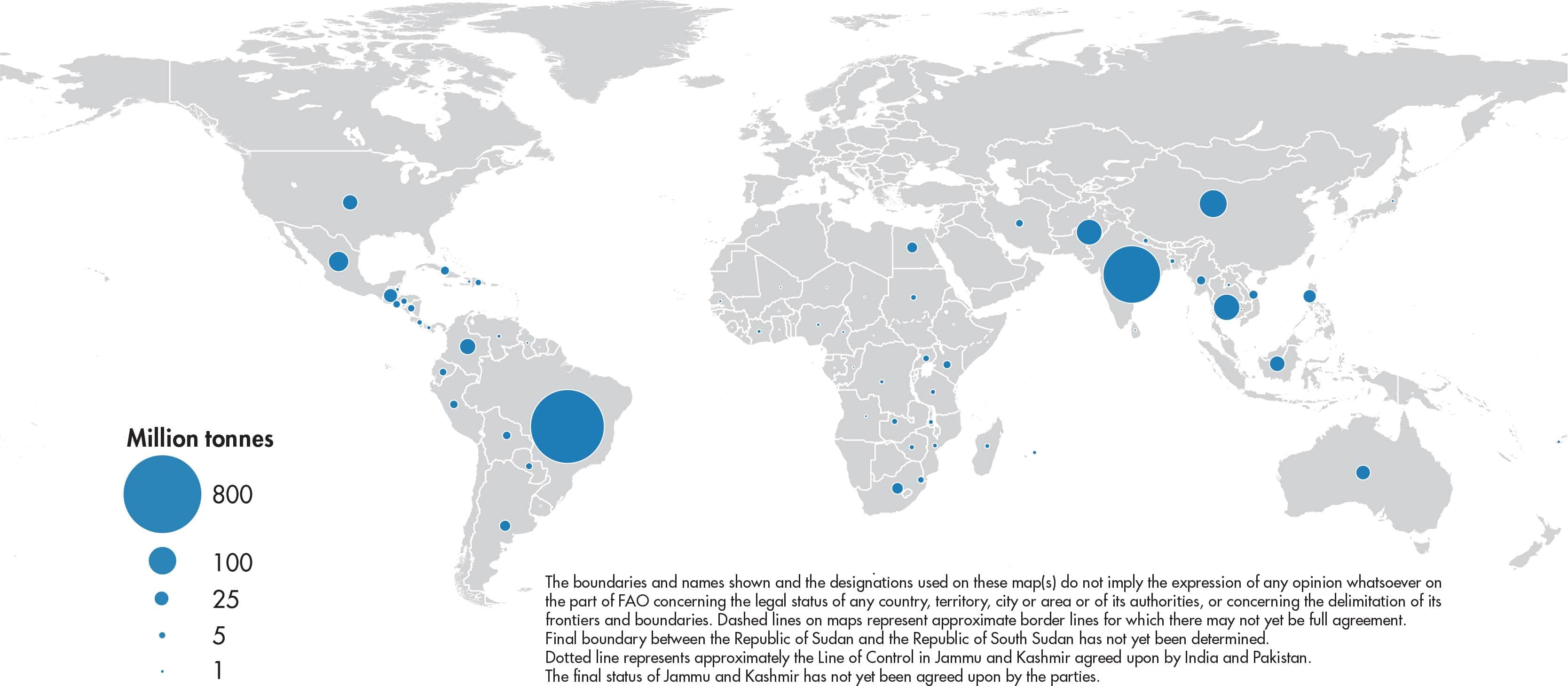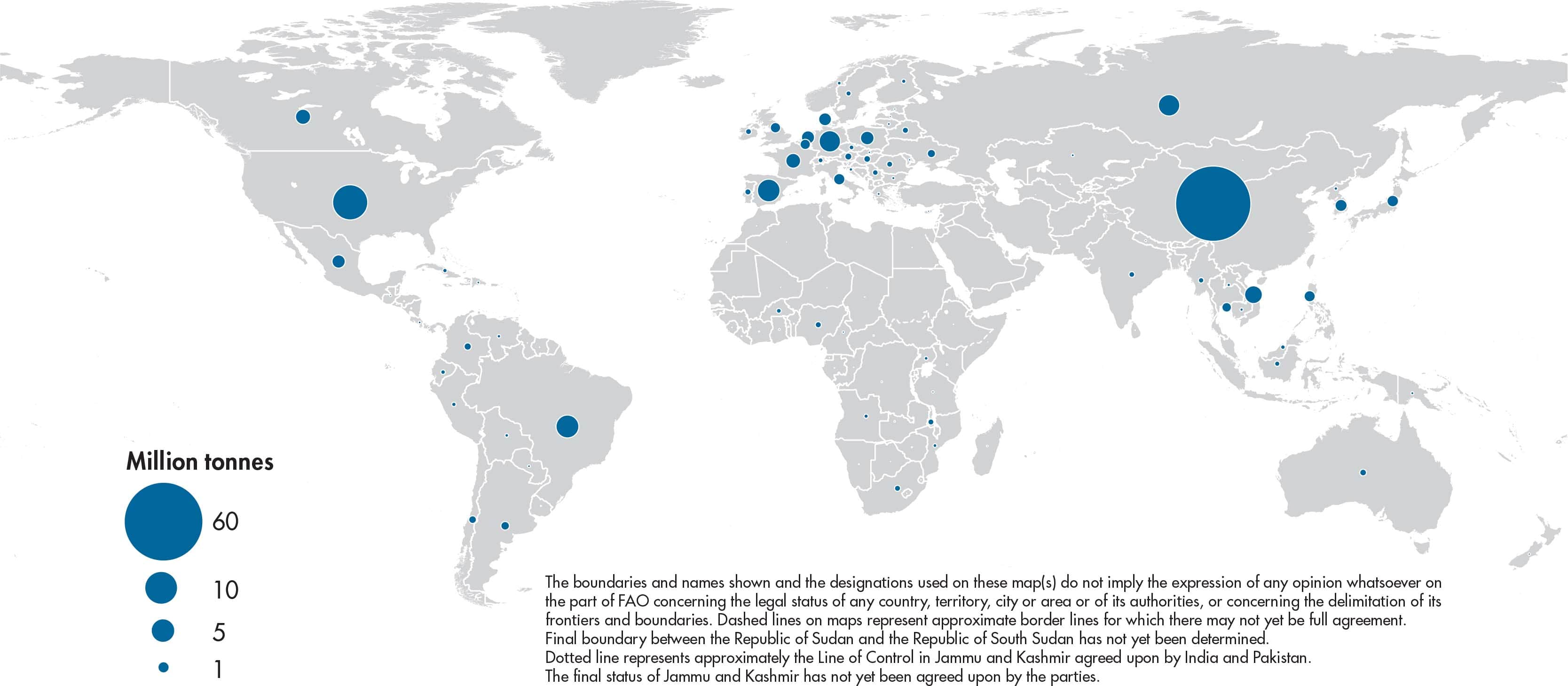 Figures relate to the total domestic production inside or outside the agricultural sector, i.e. they include non-commercial production and production from kitchen gardens. Unless otherwise indicated, production is reported at the farm level for crop and livestock products (i.e. in the case of crops, excluding harvesting losses) and in terms of live weight for aquatic animal products (i.e. the actual ex-water weight at time of catch). All data shown relate to total meat production from both commercial and farm slaughter. Data are expressed in terms of dressed carcass weight, excluding offal and slaughter fats. Production of beef and buffalo meat includes veal; mutton and goat meat includes meat from lambs and kids; and pig meat includes bacon and ham in fresh equivalent. Poultry meat includes meat from all domestic birds and refers, wherever possible, to ready-to-cook weight.