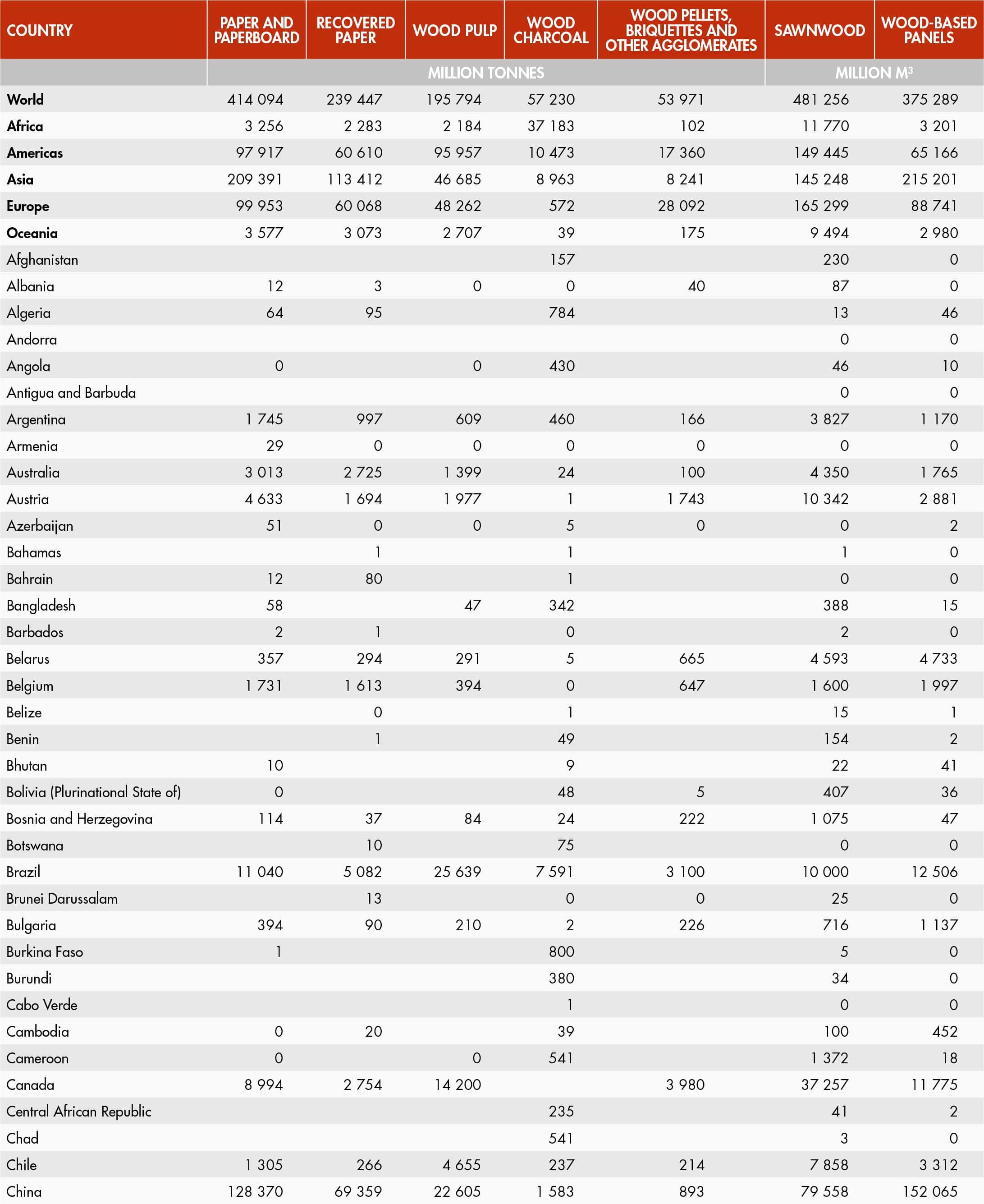 Forest product production includes the production of products that may immediately be consumed in the production of another product (e.g. wood pulp, which may immediately be converted into paper as part of a continuous process). This includes production from all sources within the country including public, private and informal sources. It excludes the production of veneer sheets that are used for plywood production within the same country. It is reported in cubic metres of solid volume in the case of roundwood, sawnwood and wood-based panels and metric tonnes in the case of charcoal, pulp and paper products.