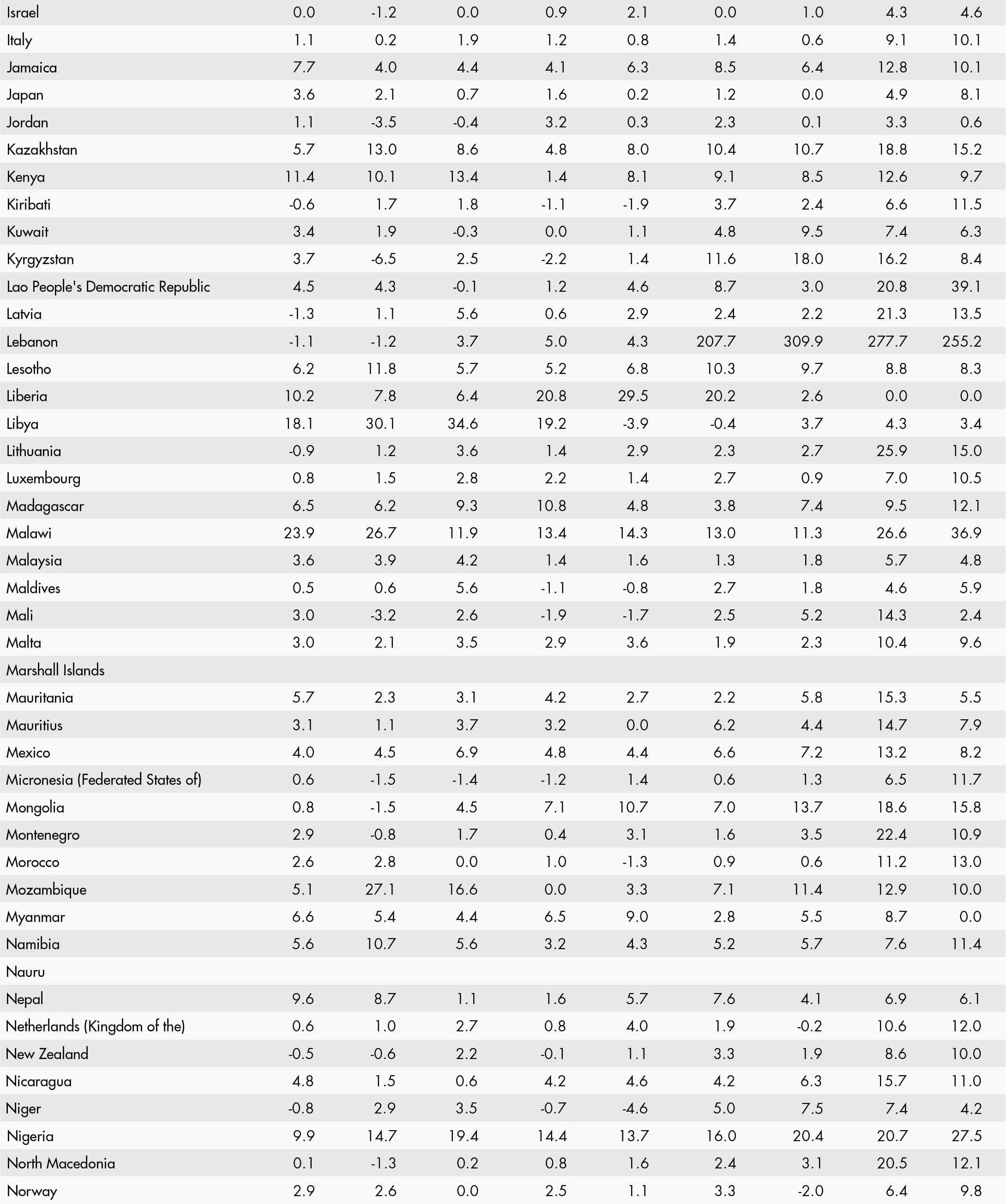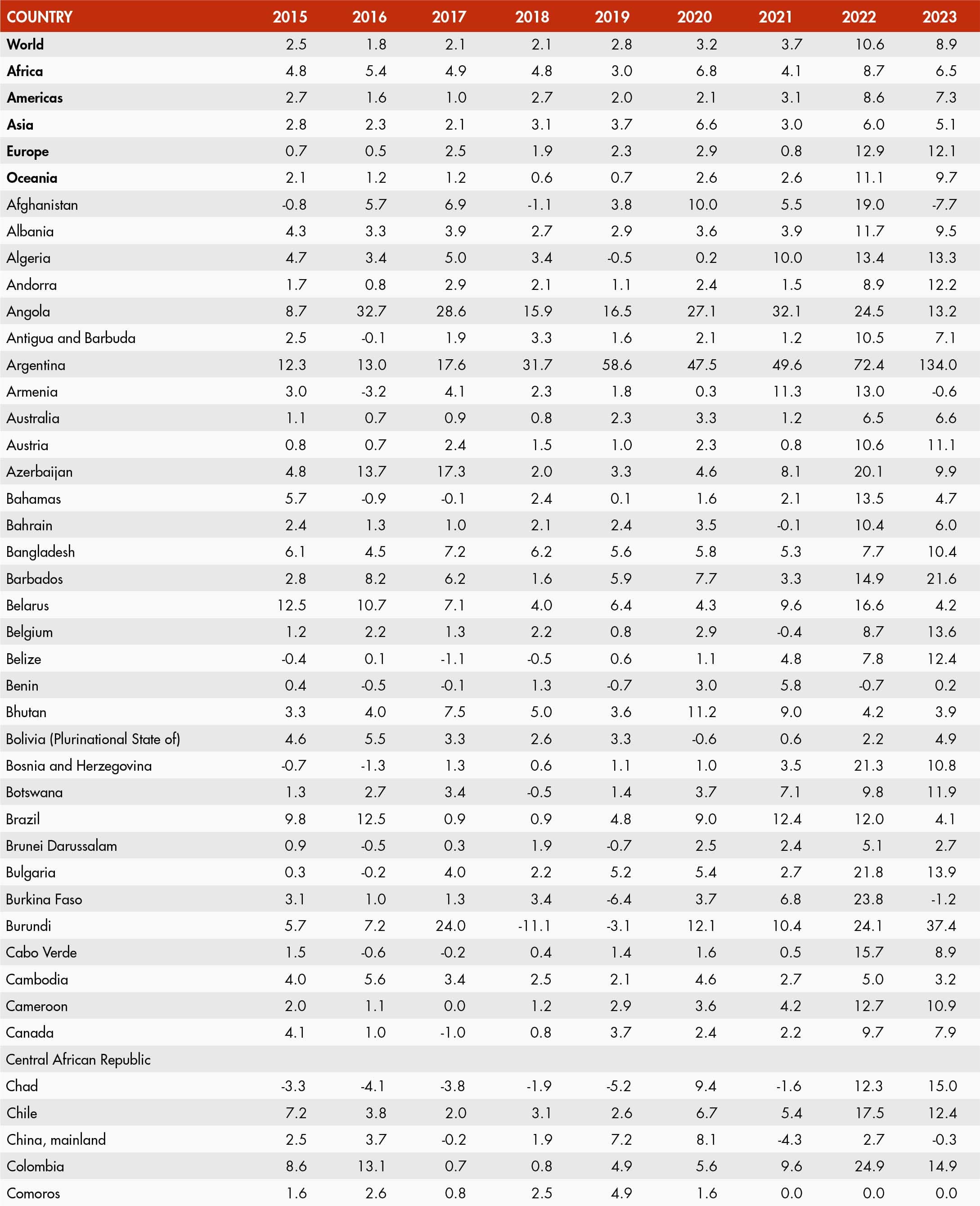 The inflation rate of an index for any month refers to the percentage change in the index value for the month as compared to the index value of the corresponding month of the previous year. Global and regional food consumer price inflation measures food inflation for a group of countries at different geographical scales: Africa, Europe, Oceania, Latin America and the Caribbean, North America, and Asia. Global and regional inflation are calculated using household consumption expenditure weights.