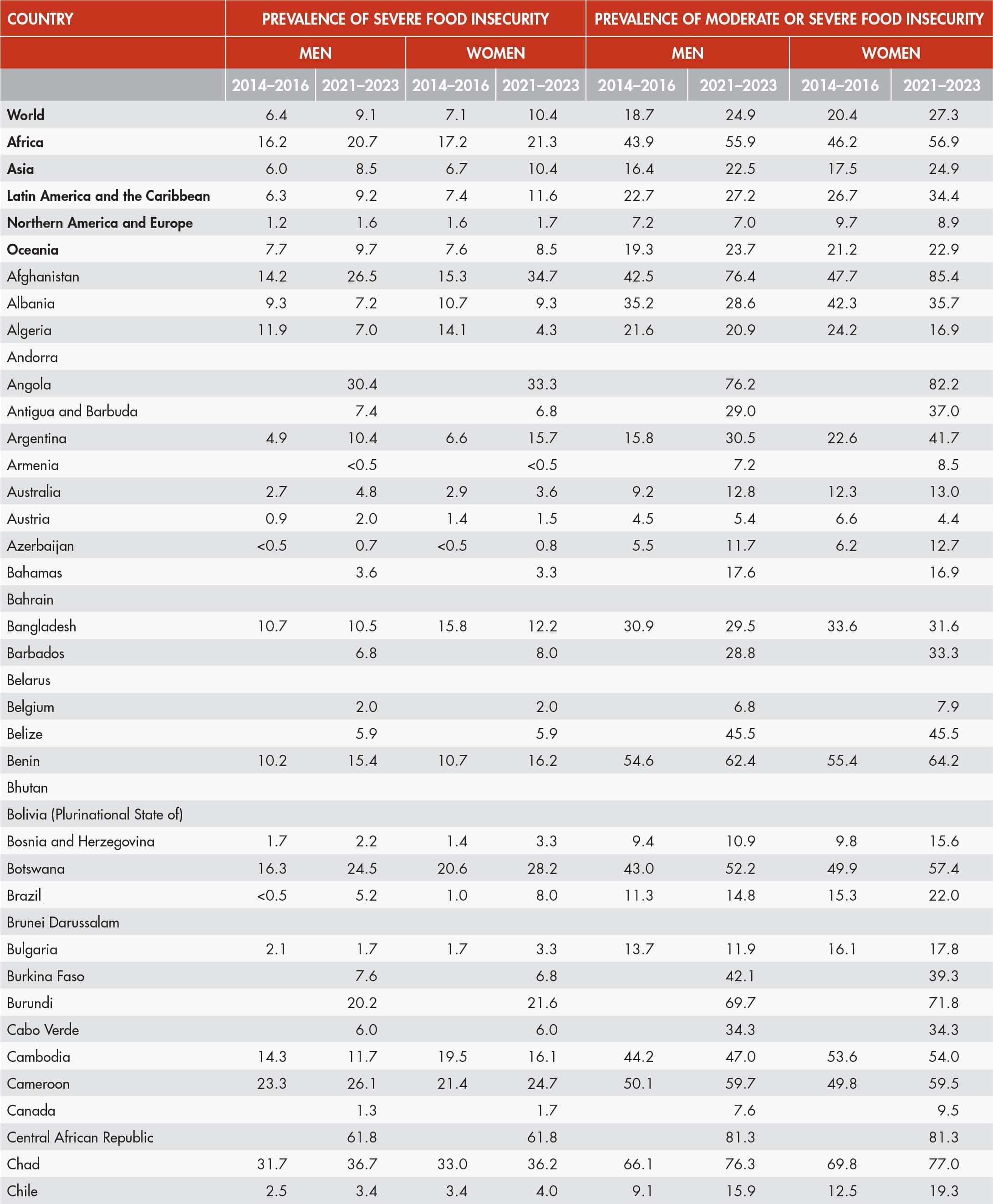 50. Food insecurity levels by region and sex (2023)