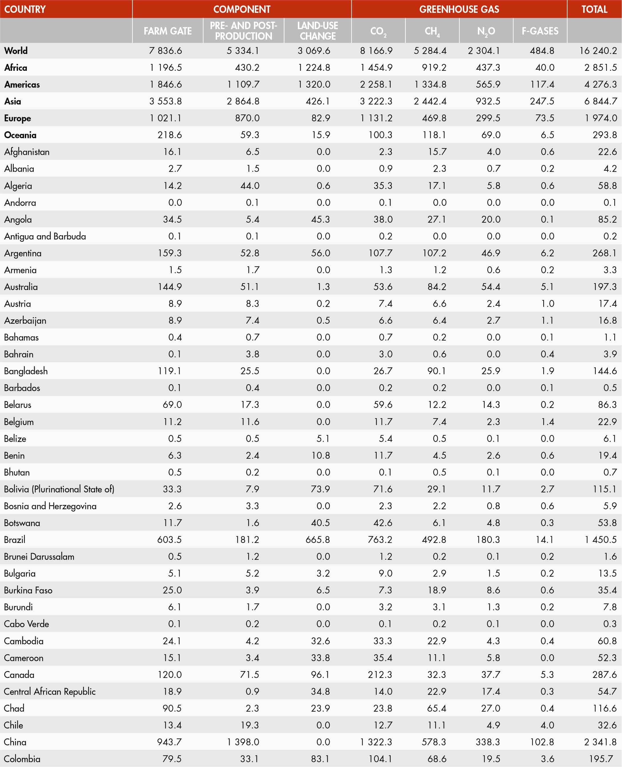 Farm-gate emissions cover all agricultural processes within farms related to crop and livestock production (enteric fermentation, manure management, rice cultivation, synthetic fertilizers, manure applied to soils, manure left on pastures, crop residues, drained organic soils, burning of crop residues, savanna fires), including energy use and drained organic soils within the farm. Non-CO2 gases, namely CH4 and N2O, are produced by crop and livestock production and management activities whereas CO2 emissions are produced from the drainage of organic soils and on-farm use of fossil-fuel based energy (including electricity and heat generated off farms). Emissions are computed following Tier 1 Intergovernmental Panel on Climate Change (IPCC) 2006 Guidelines for National GHG Inventories.