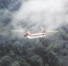 This long-term Sarawak operation used a 680 kg grapple to grasp the logs for transportation by the Boeing 234 Chinook helicopter for distances of up to five kilometres.