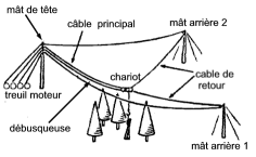 A triangular running skyline system, one of three plane-type cable systems used in Japan.