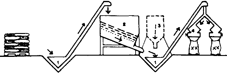 En las grandes instalaciones se realiza el apilamiento de los sacos con ayuda de un transportador de cinta sin fin, pero en los pequeños almacenes se prefiere un elevador móvil, de uso más fácil pues ocupa poco espacio en el suelo.