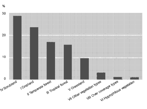 All data derived from the overlay process were grouped into three major land- cover clusters. The first (referred to as primary land cover) included all categories dominated by primary land cover types such as temperate forests, tropical forests, xerophytic scrublands and hygrophilous tree-dominated vegetation types. The second cluster (referred to as secondary land cover) included temperate forests, tropical forests and xerophytic scrublands dominated by secondary vegetation types. The third cluster (so-called human-made land cover) comprised categories such as crops, exotic forest plantations, improved grasslands for livestock production and human settlements.