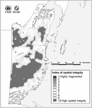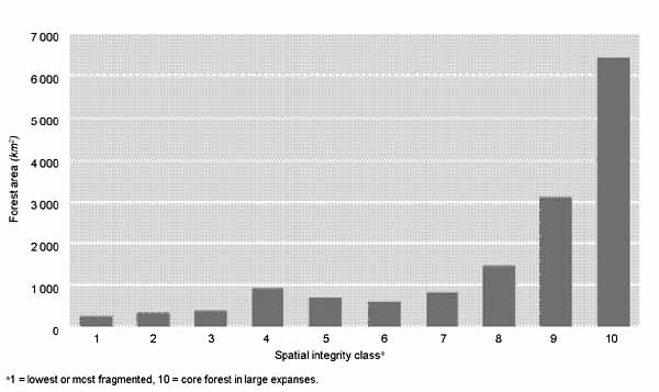 Appropriate summary and presentation of data are also critical in the effective use of indicators. To aggregate results of forest inventory at the local scale for reporting at the national scale, and to monitor change over time, data can be summarized by categories and presented in relation to forest area. For example, forest fragmentation as evaluated by an index of spatial integrity can be expressed as forest area belonging to each class of spatial integrity (see Figures 1 and 2). A country might characterize the structural complexity of its forest resources in terms of the total area of forest within different classes of canopy openness, crown depth or numbers of canopy layers. Species richness could similarly be presented as the area of forest possessing more than a certain number of tree species per unit area or per 1 000 individual trees. Such categories could be expressed in qualitative terms determined according to local or national conditions. For example, disturbance classes of high, medium or low timber extraction could be defined based on the frequency of cut stumps encountered in inventory plots.
