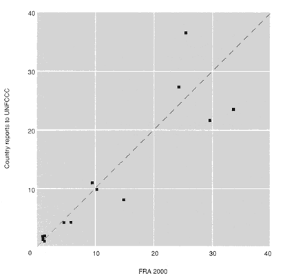 FRA 2000 will continue to provide information for the negotiations on the role of forests for the second and subsequent commitment periods, due to start in 2005. However, some discrepancies have been observed between recent reports by some European countries to UNFCCC on forest carbon stock changes (Löwe, Seufert and Raes, 2000) and data in FRA 2000 (UNECE/FAO, 2000) (Figure 2). Similar incongruities sometimes appear in reports by developing nations on carbon emissions from deforested lands (Herold, 2001).