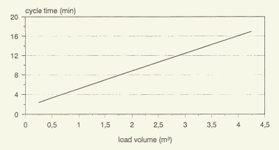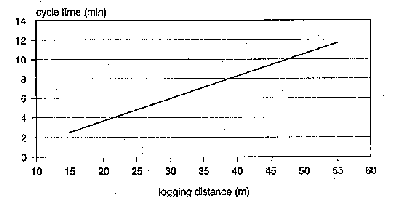 Figure 5 shows the correlation between cycle time and load volume and Figure 6 between cycle time and logging distance. The low degree of explanation by only one independent variable demonstrates, therefore, the large variety of influences responsible for cycle time and logging performance.