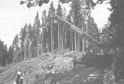Since in Austria the road network was started at a time when the clear felling system was in use and is nearly completed today in most forest enterprises, it must be considered in predetermin-ing the suitable logging system. Due to the comparatively small radius of the construction crane its use seems to be rather limited at first consideration, but there are likely to be more areas suitable than one would think for the above mentioned logging equipment.