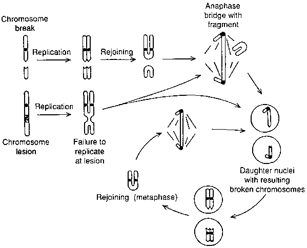 Muller further discovered that X-rays when applied in sufficiently high doses break chromosomes and that two broken ends of chromosomes that contact each other, being sticky, tend to adhere and heal together. Furthermore, two broken ends, each with a site of attachment to a spindle fibre, may heal together to form a "dicentric" chromosome with two sites of attachment to spindle fibres. When the cell begins to divide, the dicentric chromosome may be pulled toward opposite poles of the cell. Often, if the dicentric chromosome fails to break, then the cell cannot divide, and it dies. If the dicentric chromosome breaks at a new place, then one cell will receive a deficiency of genetic information, and the other a duplication of information. In addition, each chromosome piece from the original break that has no site of attachment for a spindle fibre cannot be pulled into a daughter nucleus during cell division. Thus, the daughter cells may not receive all of the genetic information needed to function. These and other chromosomal events culminate in the death of any embryo formed by the fertilization of a normal egg cell with irradiated sperm (see Figure 1).